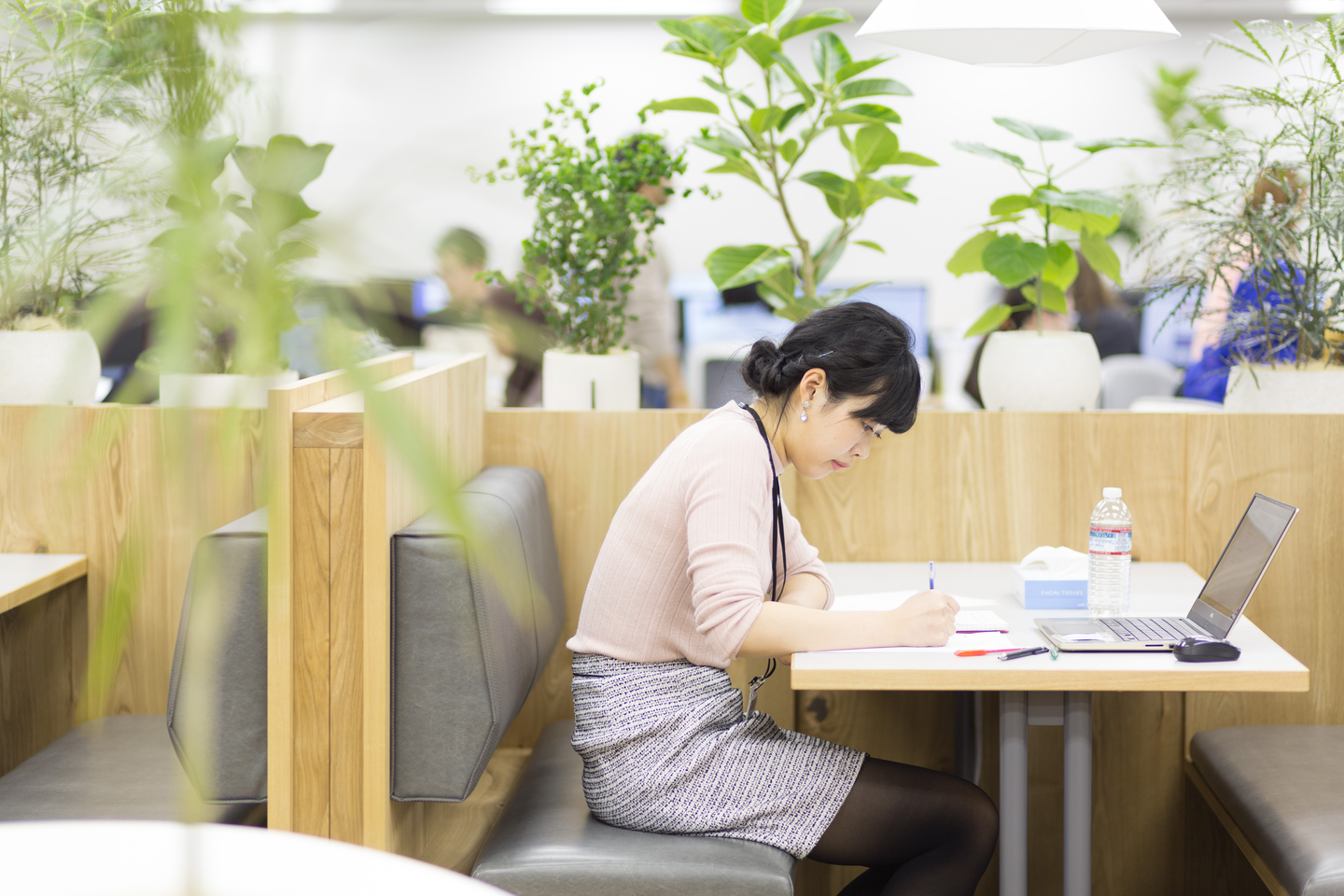 まずは、メインのワーキングスペースとなるこちらの区画。緑がたくさんあり、机も木の素材なので柔らかい雰囲気です。小さく音楽が流れているので、ゆったりと落ち着いて仕事をすることができるスペースとなっています。
