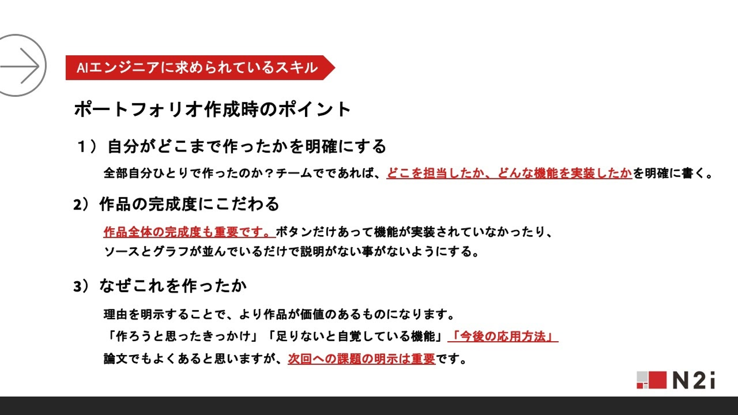なお、「ポートフォリオ作成時のポイント」について、参考になりそうなものがありましたので、こちらにはっておきます。「AIエンジニア」の箇所をご希望の職種に置き換えて目を通してみてください。