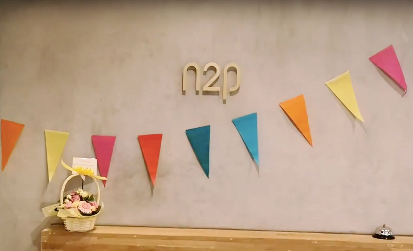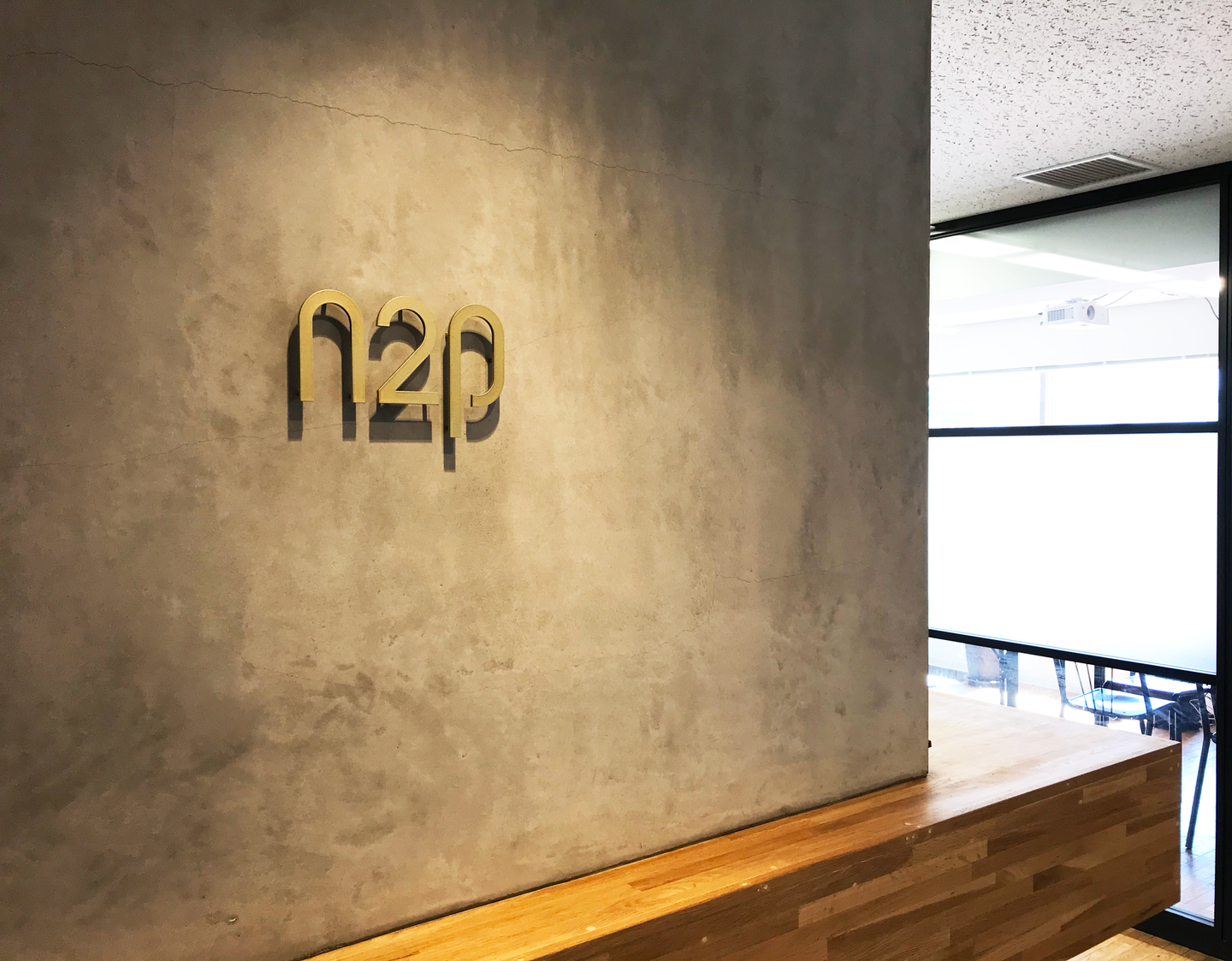 こちらは、エントランスです。 会社の顔でもある、n2pロゴが皆さんをお出迎えします。