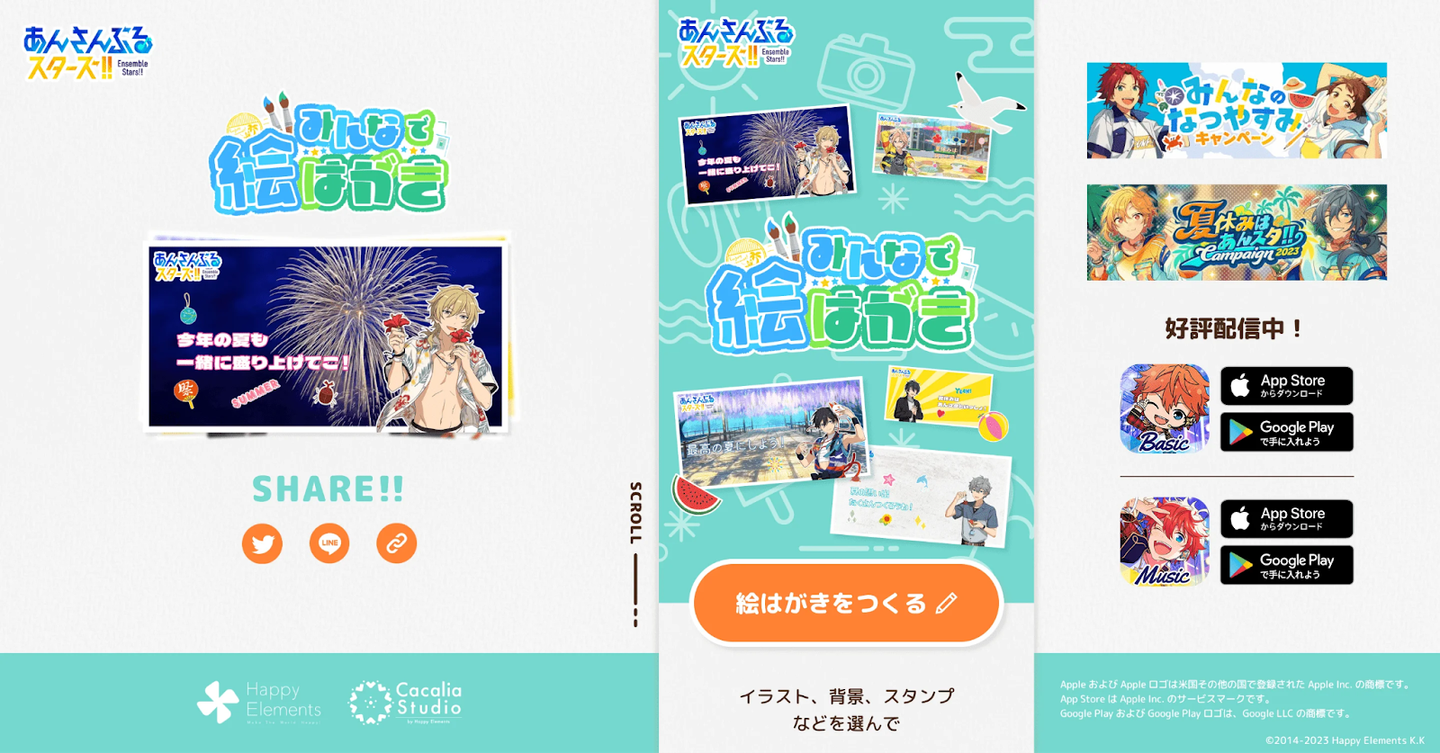 2023年の夏頃に実施された、アイドルプロデュースゲーム『あんさんぶるスターズ!!』の絵はがき合成&投稿キャンペーン。n2pでは仕様策定から、デザイン、コーディング、システム制作までを担当いたしました。