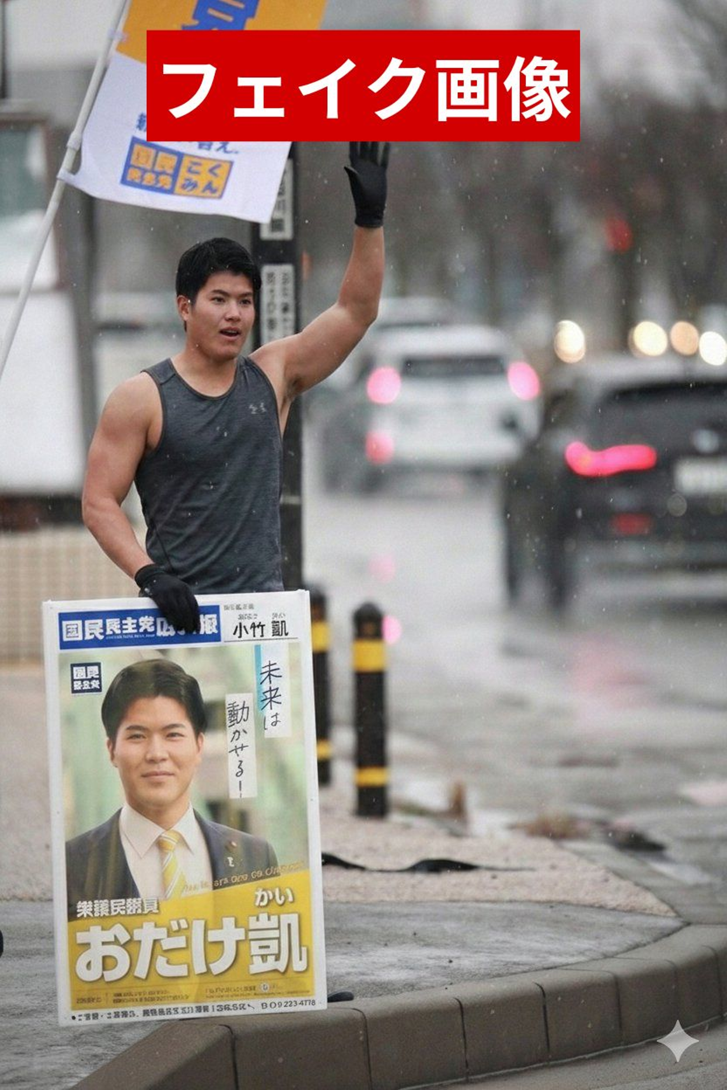 2026年、立候補予定者がタンクトップを着て街頭に立つフェイク画像(引用:X)