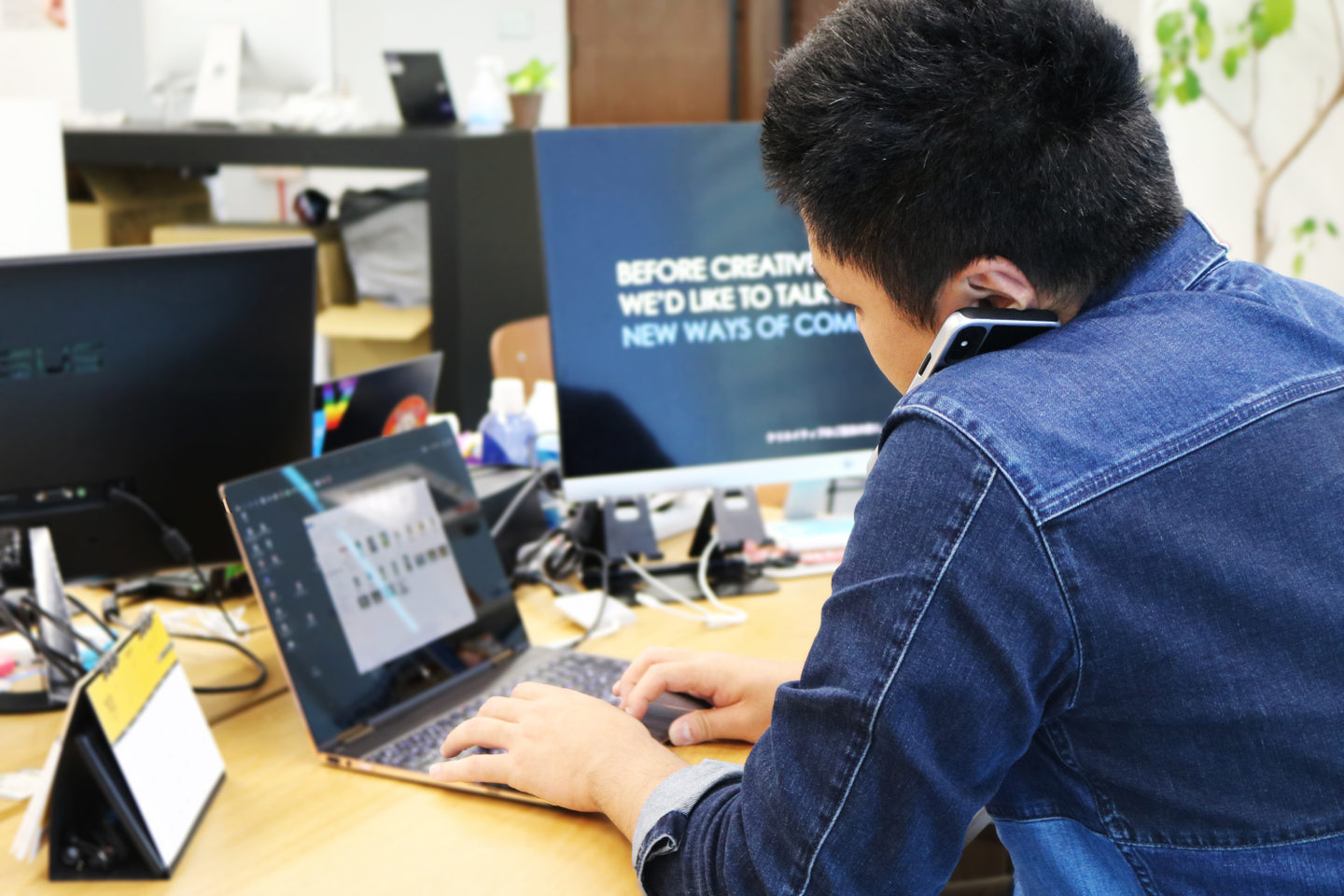 企画書を作る日は朝から晩までずっとパソコンに向かってたりもしますし、撮影があれば外に出て朝から晩まで立ち会いという日もあります。パソコンがあってクライアントと会話ができればどこでも仕事はできるので、移動時間で少し間が空けばそのまま外で作業、なんて日もあります。なので社内にいないって思われがちなのかも・・・(笑)