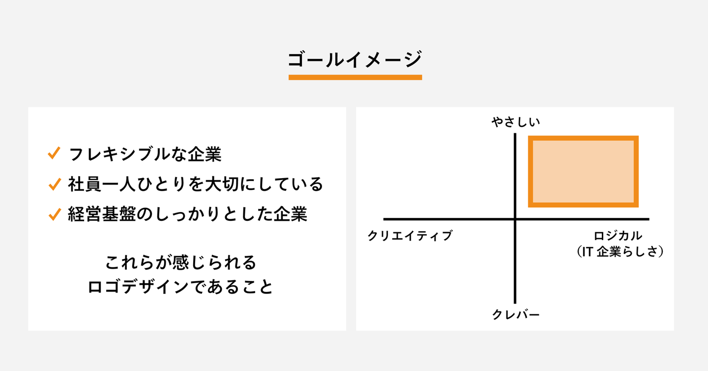 今回は、「会社の特色である、お客様の要望にフレキシブルに対応できる企業」「社員一人ひとりを大切にしている企業」というゴールイメージを共有いただき、後ほど見返せるように資料として整理しておくことにしました。こうすることで、できたロゴデザインに対して、「フレキシブルなイメージがどれくらい感じられるか?」「社員一人ひとりを大切にしてくれそうに感じられるか?」といったチーム共通の視点で評価ができるようになります。