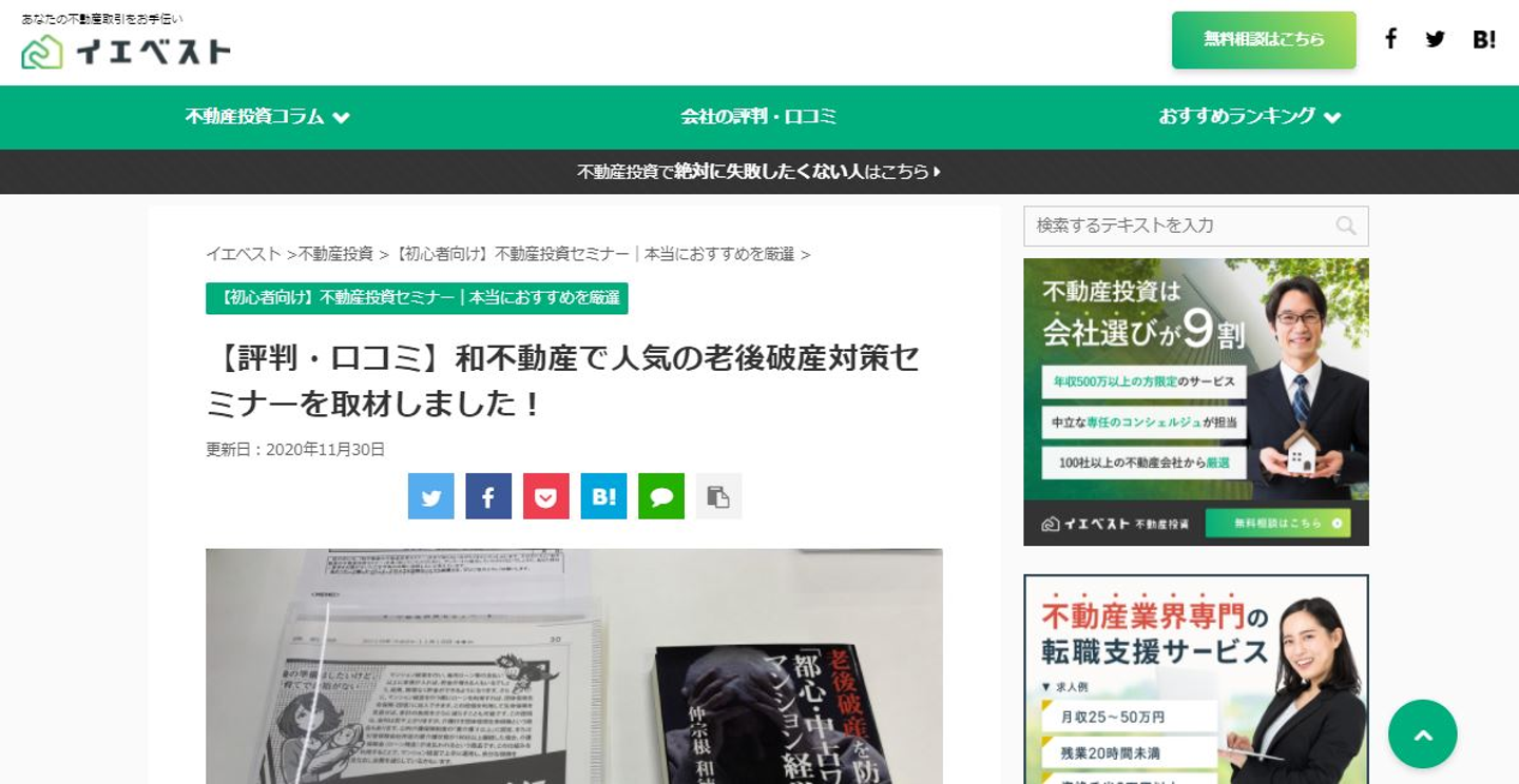 また、「イエベスト」では、当社のマンション投資セミナーへの取材模様が掲載されています!代表・仲宗根が執筆した、書籍の理解がより深まる「老後破産対策セミナー」と、その独自性から高い口コミ・評判を頂いているゲーム体験型セミナー「キャッシュフローdeリッチ」という、形式が異なる2つのセミナー・ゲーム会について客観的にレポートした記事となっております。