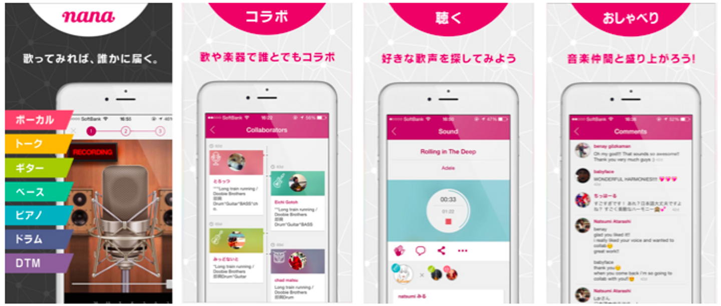 nanaは、スマホひとつで世界中の人たちといつでも、どこでも、誰とでも、歌い合ったり、楽器でセッションしあったりといった音楽でコラボレーションができる、そんなアプリです。