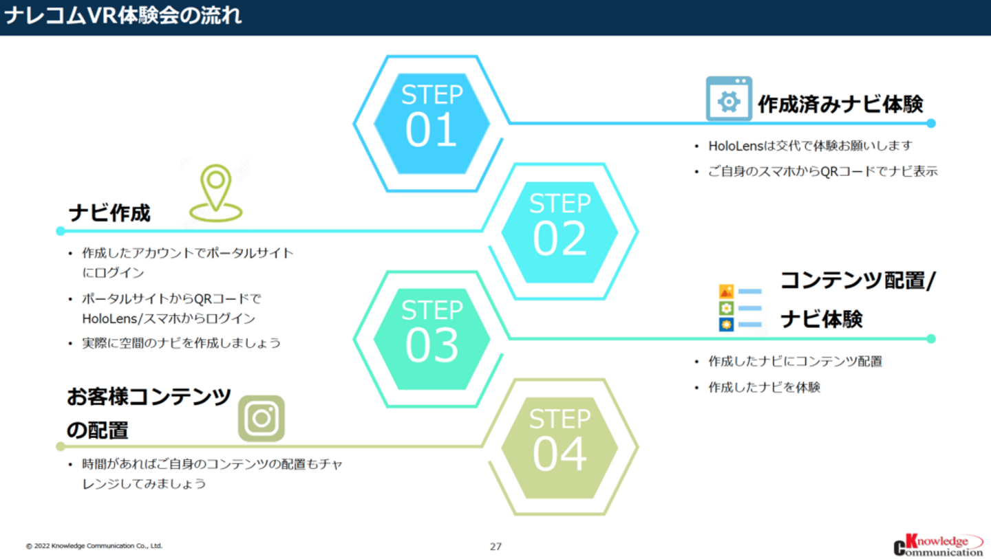 今回の体験会ではナレコムVRのインストールから実際にHololens2を被り体験頂き、MRの活用イメージを持って頂くことが目的となっております。