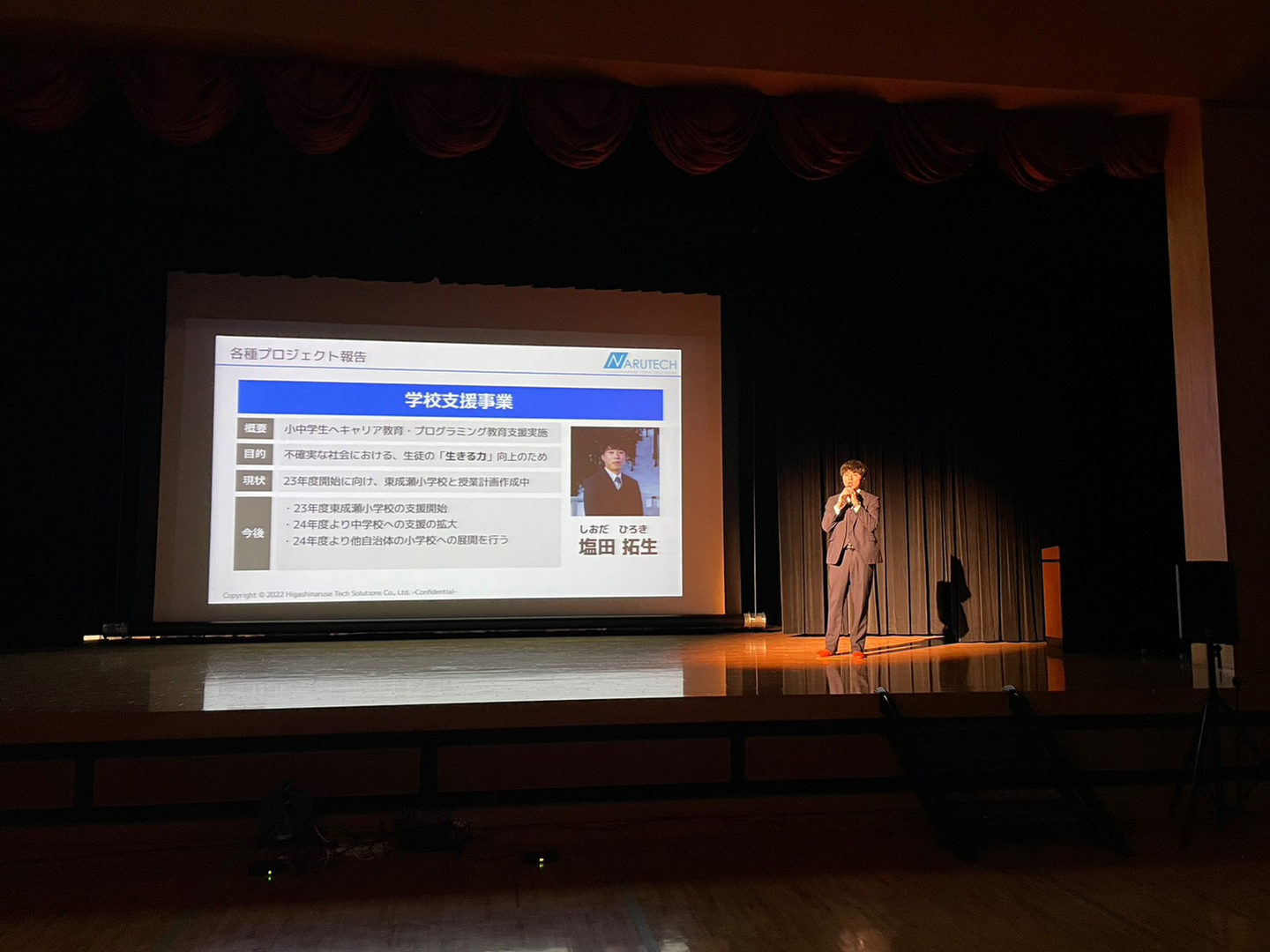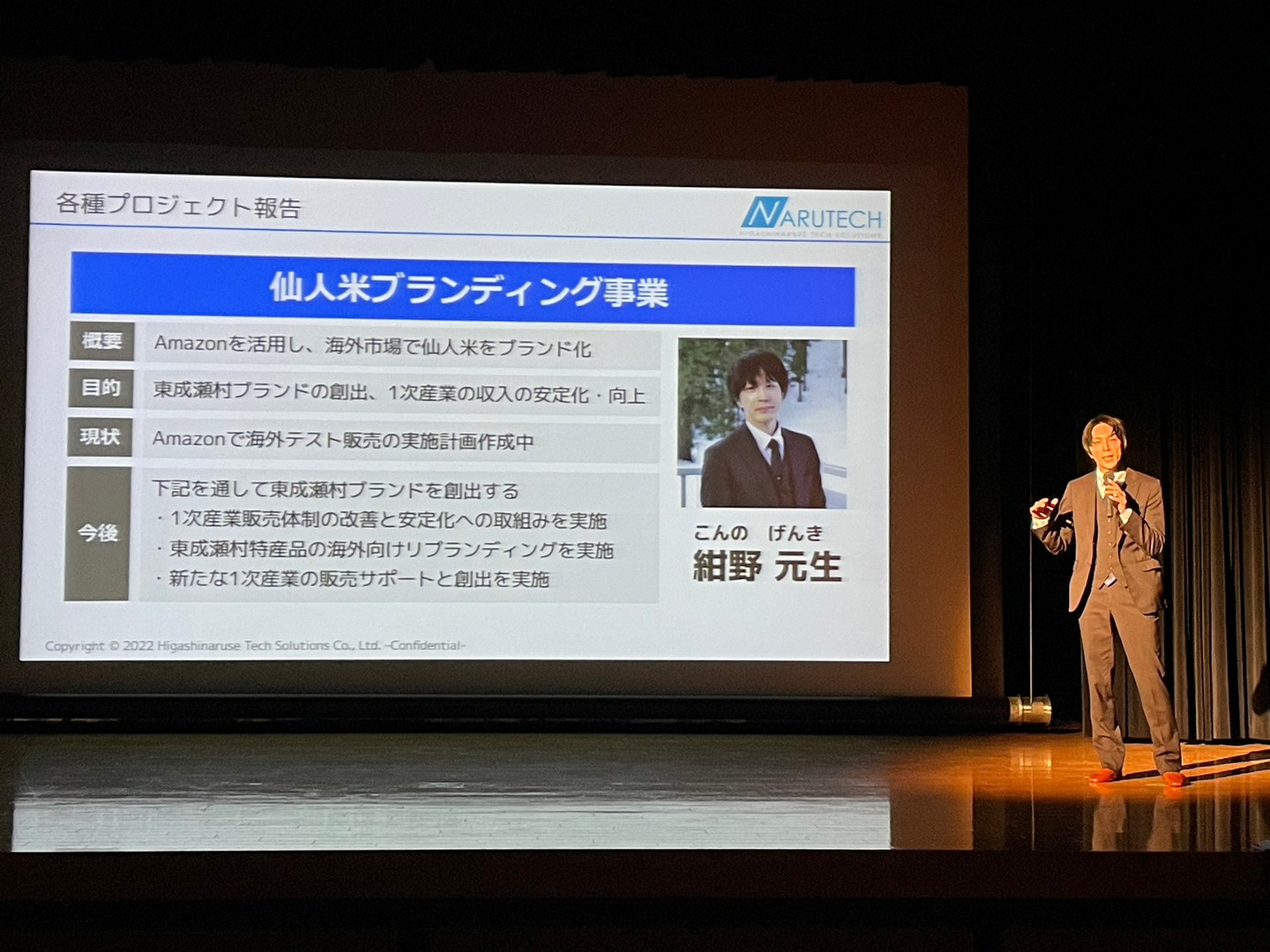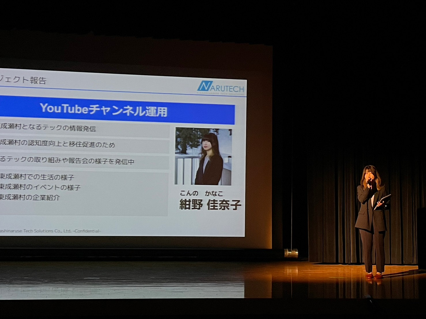 社内でスピーチ選考会を行い、登壇者を決めています。スピーチ当日はなるテックに入社したきっかけや、東成瀬村に対しての熱い思いを届けました。