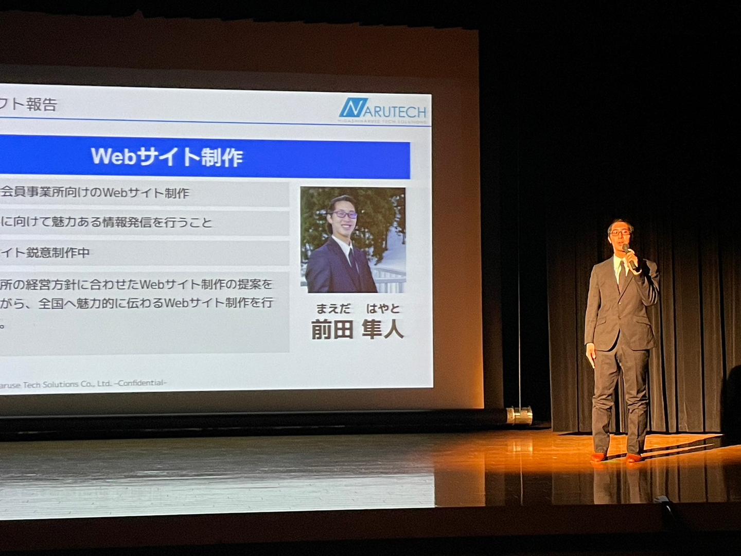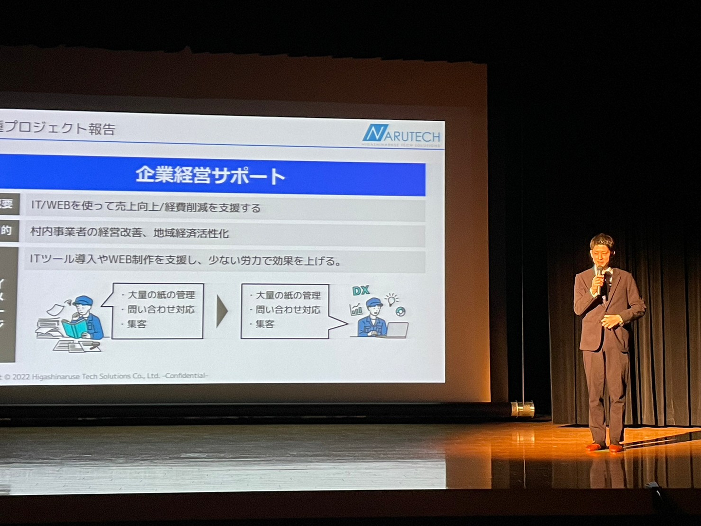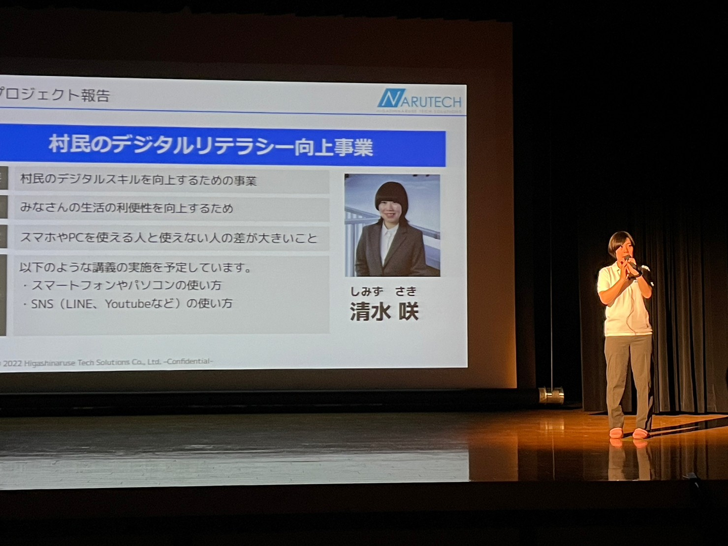 社内でスピーチ選考会を行い、登壇者を決めています。スピーチ当日はなるテックに入社したきっかけや、東成瀬村に対しての熱い思いを届けました。