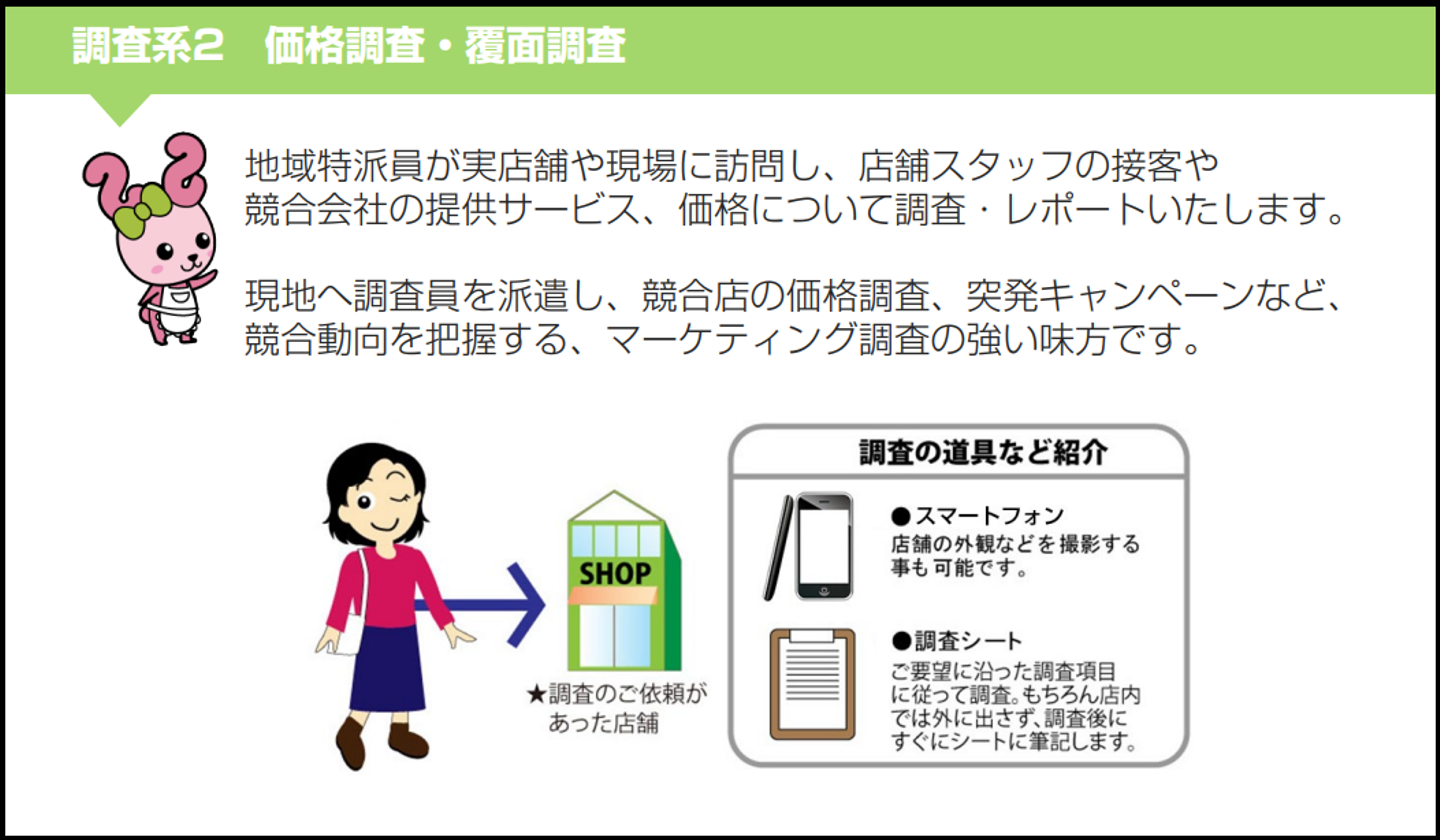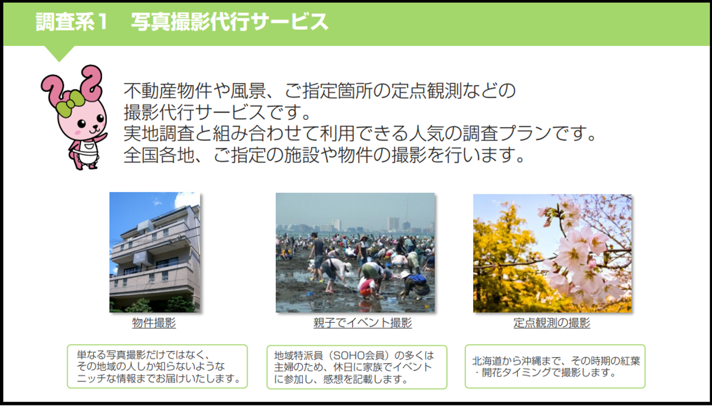 具体的には、クライアントからの依頼調査案件に応じて、SOHOへの調査依頼や収集したデータをまとめ、報告書を作成します。