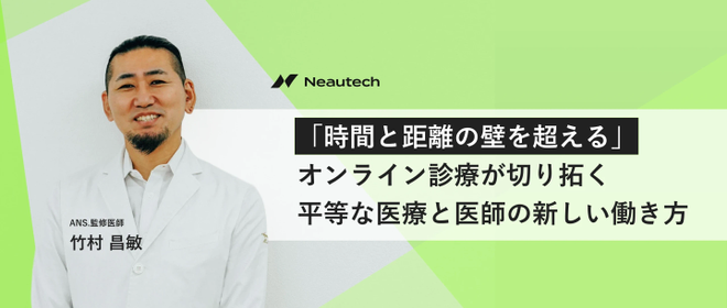 みなさん、こんにちは!株式会社Neautech(ニューテック)で広報を担当しております、赤坂です。株式会社Neautechは「医療とテクノロジーで自分をもっと好きになれる社会へ」を企業パーパスに、ANS.(ANS.)というオンライン美肌治療サービスを主軸として、化粧品開発事業、医療DX事業の3つの事業を運営しているスタートアップ企業です。今回は、ANS.監修医であり、オンライン診療の第一人者でもある竹村昌敏先生にインタビュー!医療における新たな選択肢として注目されているオンライン診療についてお話を伺いました。ANS.監修医師:竹村昌敏高知医科大学医学部卒業。「オンライン診療」という言葉を...