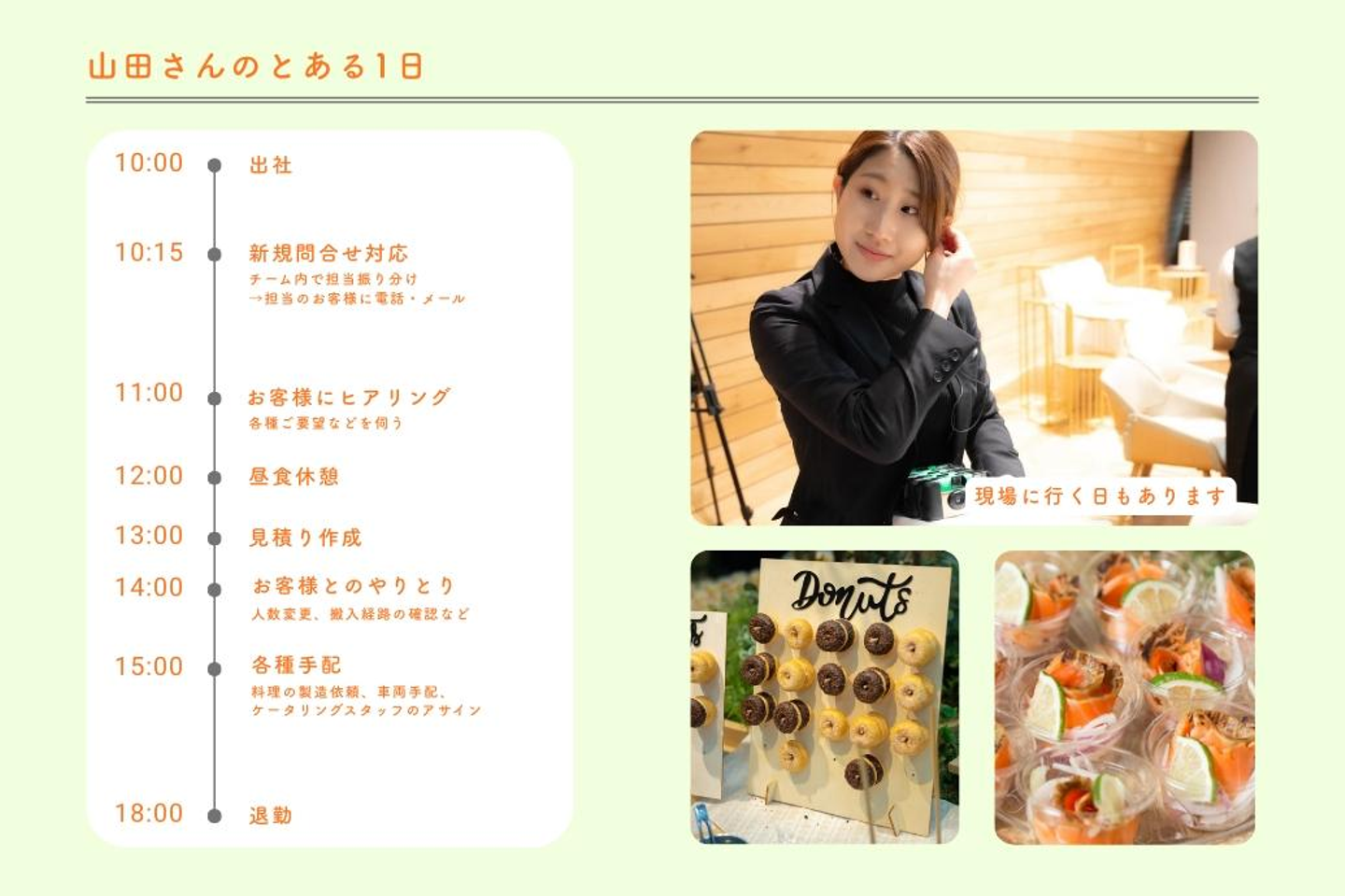 山田:たしかにそうかもしれないですね。”ケータリングだけ” ”イベントプロデュースだけ”ではなく、なんでもできるのが当社の強みでもあります。「お客様のために何ができるだろう?」と考えて、提案に移せる方は法人営業向きですね。