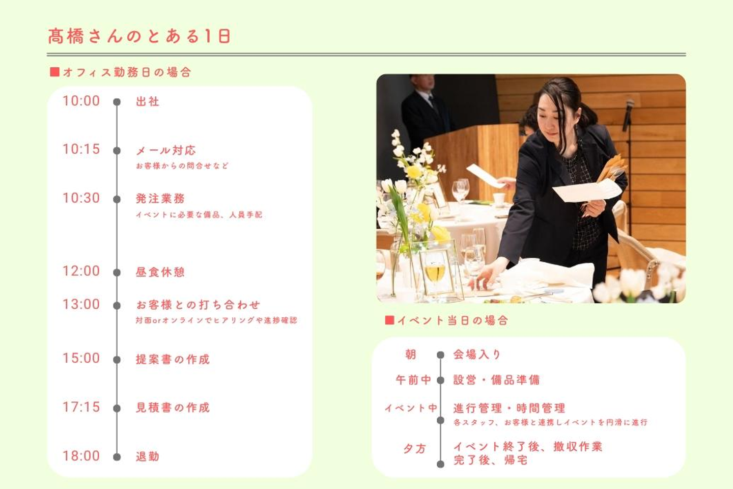 髙橋:私は企業や法人の各種イベントプロデュースを担当しています。社内表彰式や周年記念記念パーティー、キックオフイベントなど、規模や形式も様々ですね。新規のお問い合わせ対応から、提案書作成、イベントの備品準備、スタッフ手配、当日の運営まで、自分の担当案件は最後まで責任を持って見守ります。