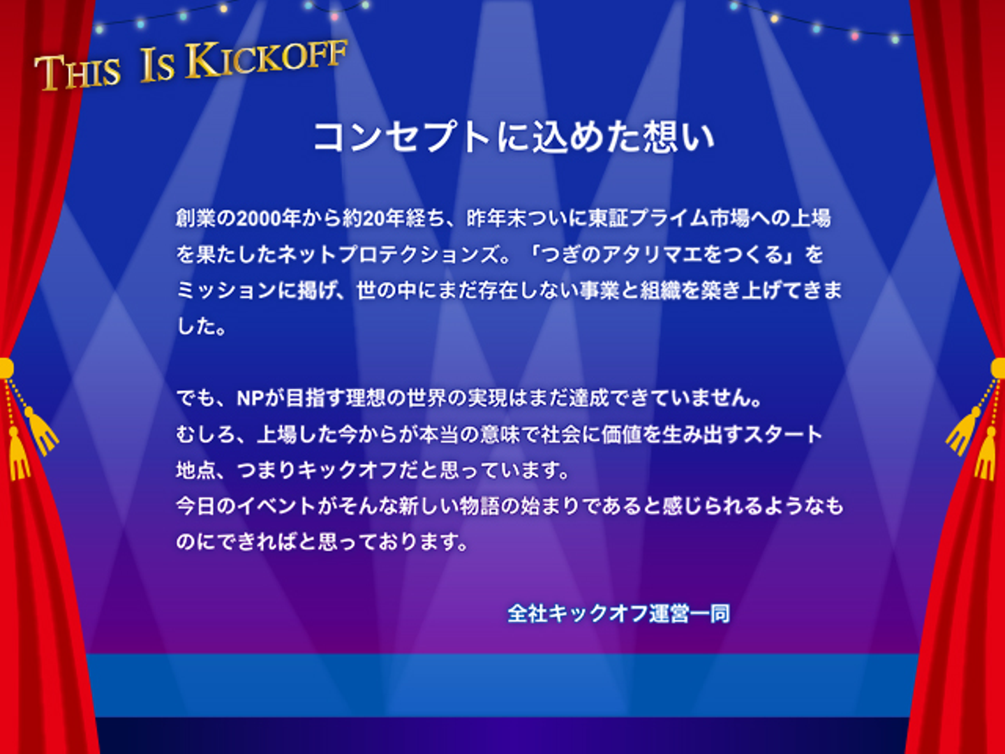 今回のコンセプトは「This is Kickoff」です。NPは昨年プライム市場への上場という、一つの目標を達成しました。しかしそれに満足するのではなく、社会により価値提供していくための、まさにキックオフだと考えています。NP全体で改めて意識を揃えるために、前述のコンセプトが設定されました。