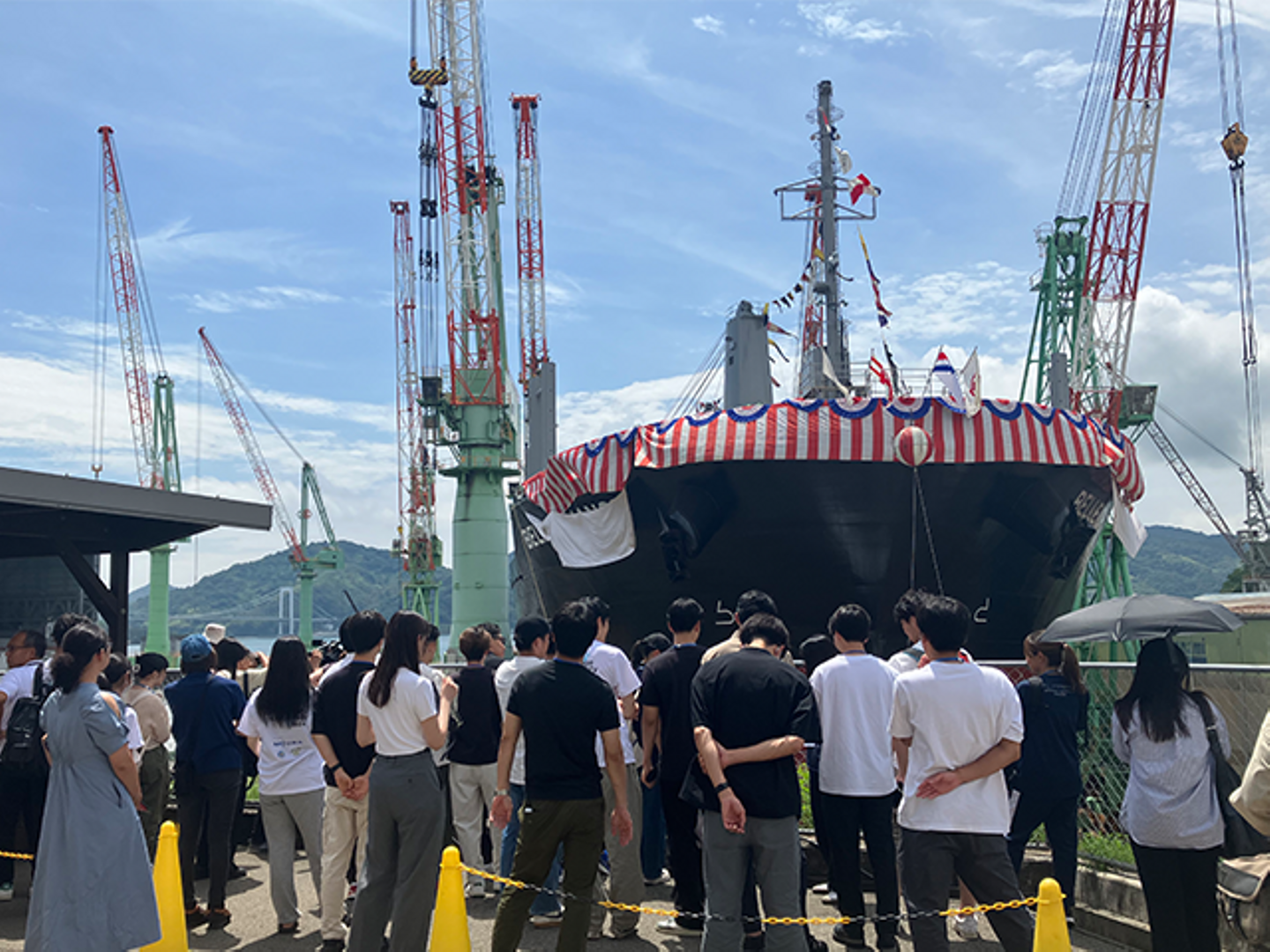私が参加した食品産業ルートでは塩の工場やワイナリー、JAを訪問。しまなみ造船様の進水式を見学し、その後今治市役所で今治の課題や行政の取り組みも確認しました。今治は「海事都市」「タオル生産量」「タレ類出荷量」「サイクリングコース」「住みたい田舎第一位」など様々な日本一があること、一方で空き家の増加や地域交通の不便さ、しまなみ街道の通行料の高さなど地域の課題もある現状を知ることができました。