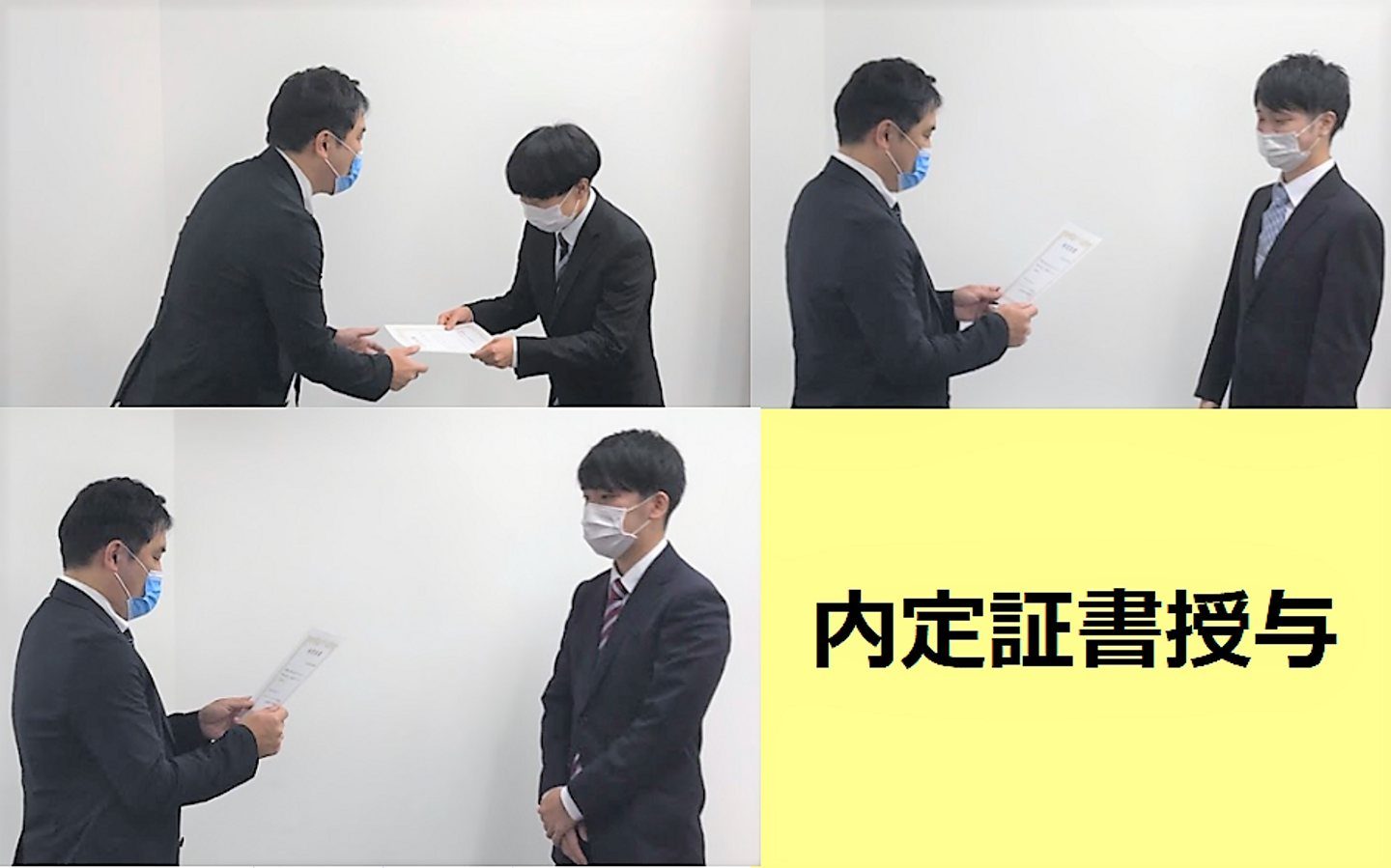内定式では社長講和、内定証書授与、総務部長・営業部門・講師社員の紹介、