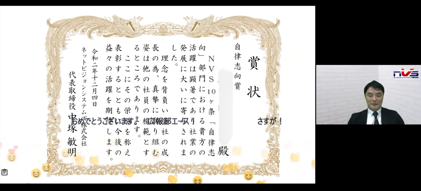 「コロナ禍でもこうしてオンラインで社員の皆と集まれて楽しかった!」