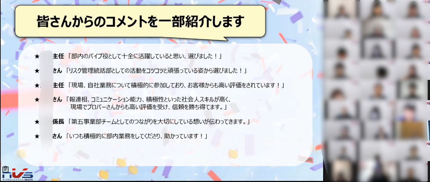 今回は惜しくも表彰を逃した社員のコメント紹介も行いました!