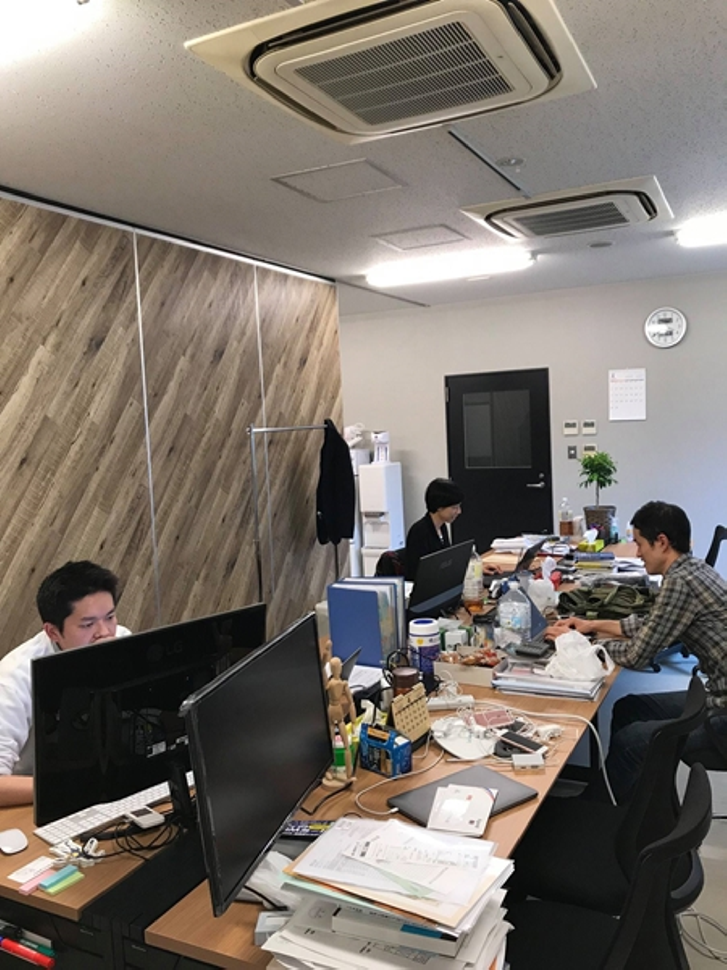 引っ越して数日後の社内。まだ雑然としています。こちらは執務スペース。パーティションの裏が仮眠スペースやラボと呼んでいる研究開発スペースです。