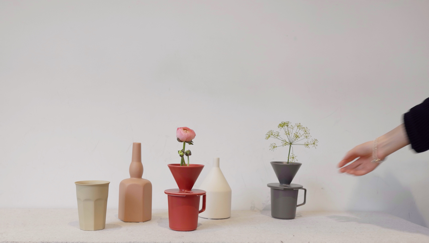 マルヒロ(波佐見焼)のソークカップにARITA JIKI(有田焼)のコーヒーカップとドリッパーを一輪挿しに用いるアイデア。