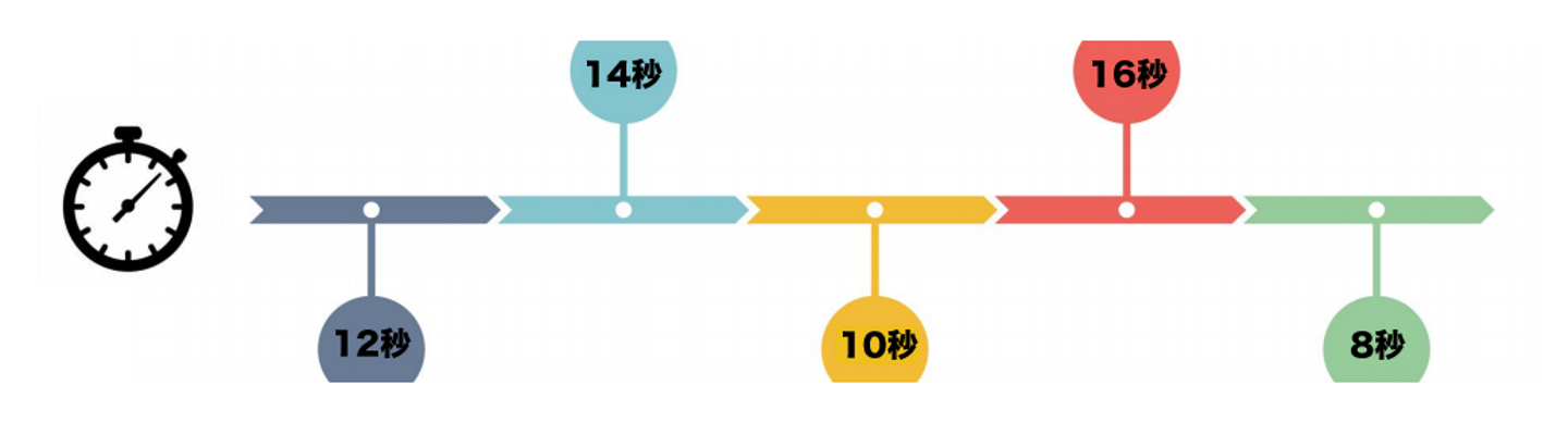 例えば上の図のように60秒の動画の中に、大きく5つのブロック(シーン)があるとします。これらブロックは12秒、14秒、10秒、16秒、8秒といった時間軸を持っており、言い換えれば、その情報の表示に制限時間が発生しています。