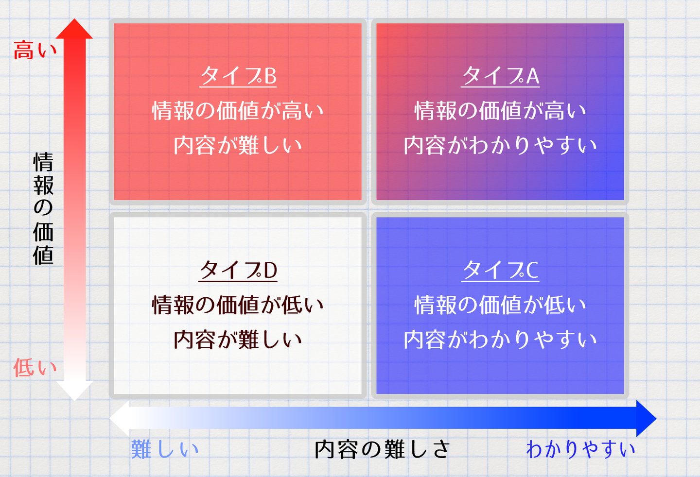 まずは「情報の価値」を考えて分類し、「内容の難しさ」でさらに分けることでA・B・C・Dの4つのタイプに整理できます。