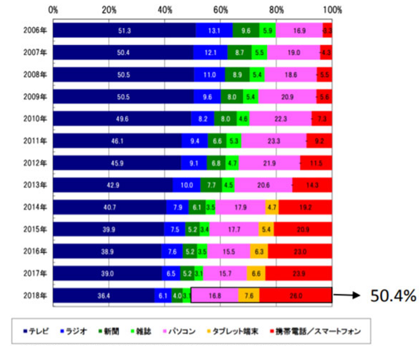 今回の調査でデジタルメディアが50%を越えてきており、2018年も更に加速していることが予想されます。特にスマートフォンの接触時間についてはここ数年急激な伸びを記録していることが見て取れます。
