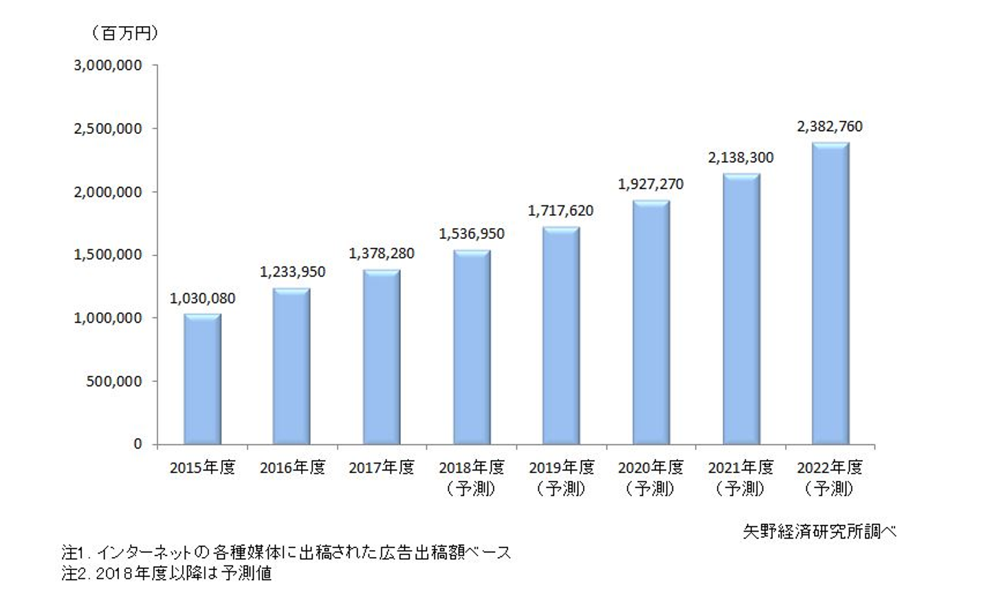 そのような流れの中、株式会社矢野経済研究所様より今年の8月に発表された調査によると、2017年度のインターネット広告国内市場規模は前年度比111.7%の約1.3兆円、2022年度には約2.4兆円までの拡大を予測されています。