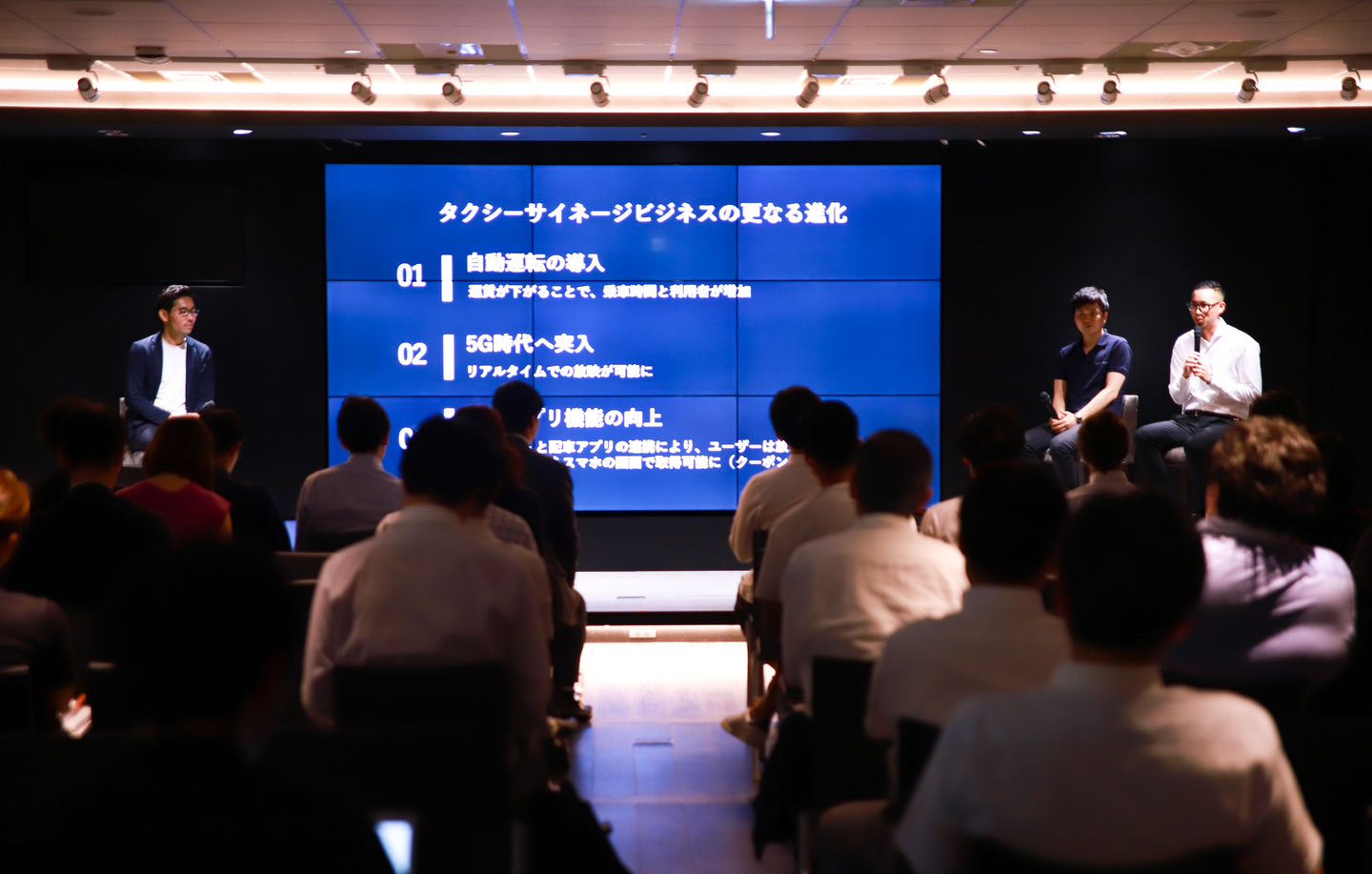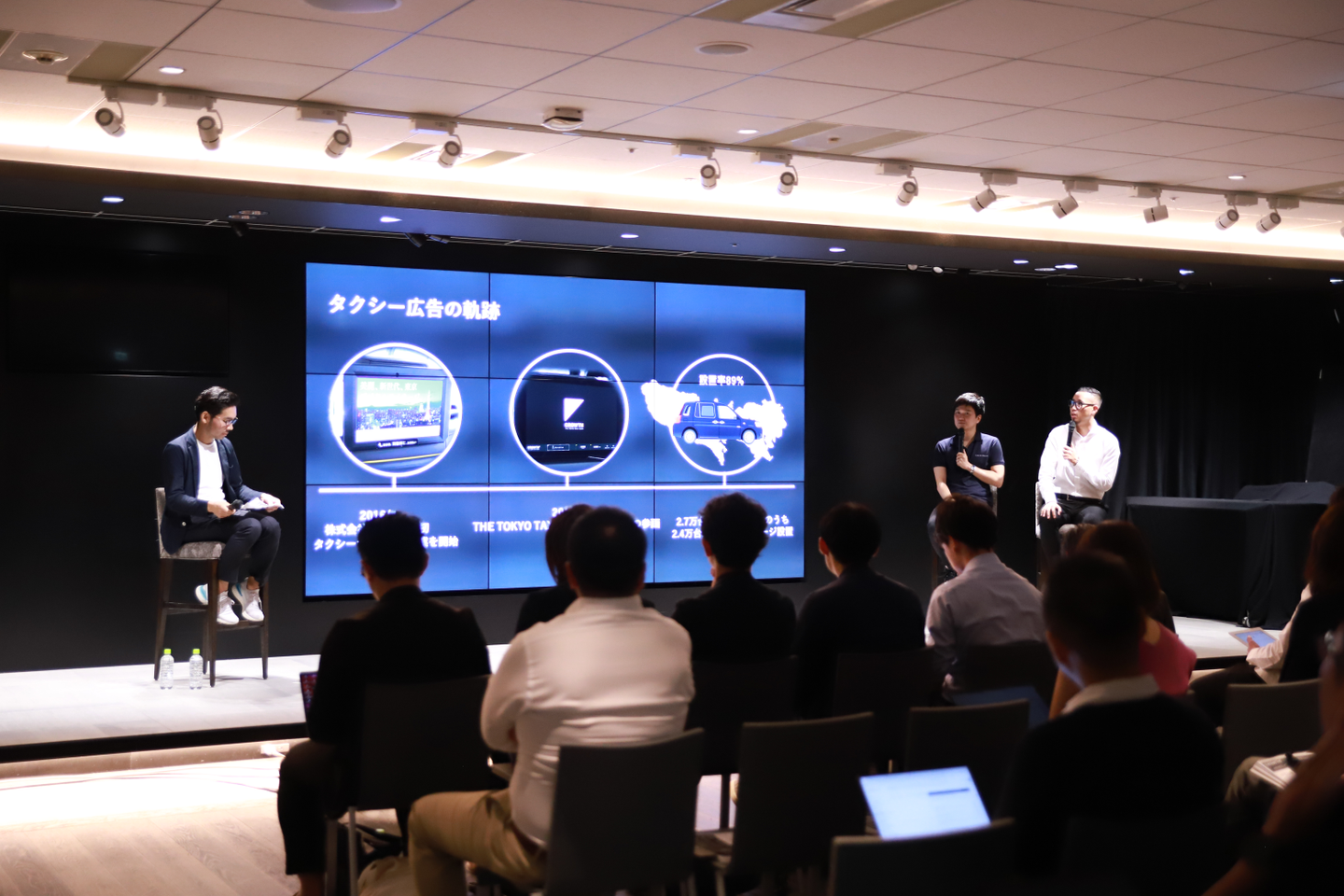 セミナー第1部•第2部では主にタクシーサイネージサービスを提供する各社の代表が登壇し、様々な事例を交えてタクシー広告の効果的な活用法などをご紹介させて頂き、第3部では、NewsPicks Studios社の佐々木紀彦CEOをゲストに迎え、タクシー広告の未来と現状をテーマとしたトークセッションを行いました。