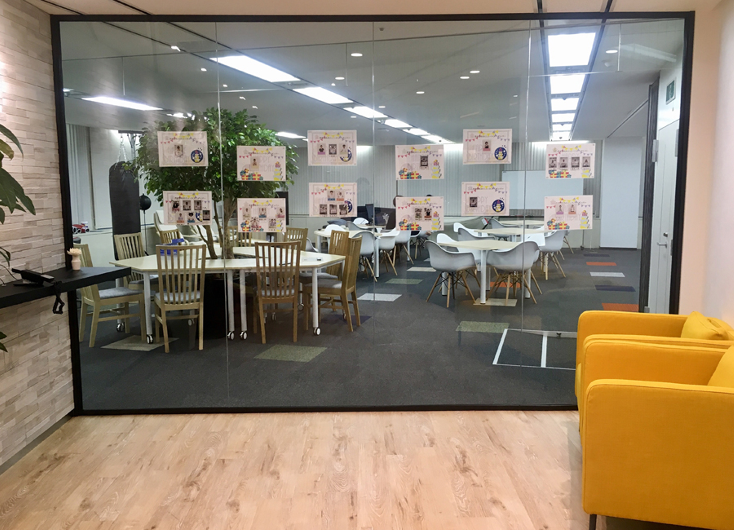エントランスを入るとガラス張りのカフェエリアが見えるのですが、この場所はコミュニケーションの場として多くの社員が利用しています。