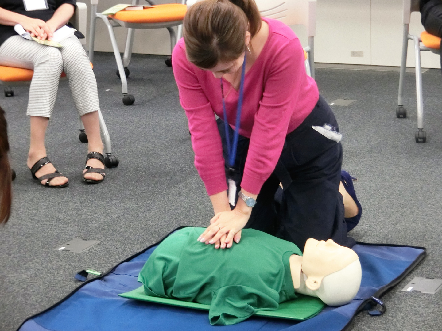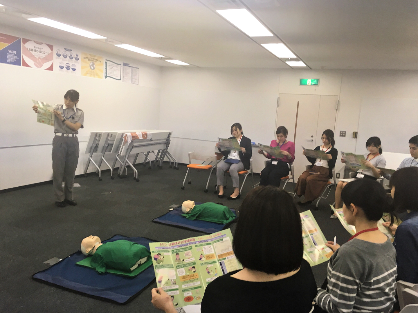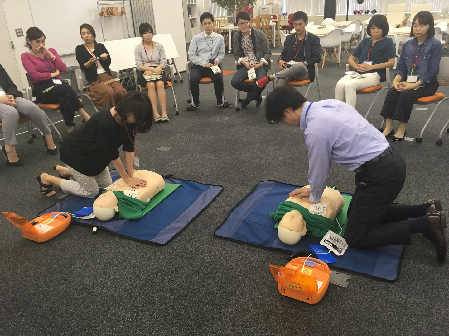 当社では新入社員を対象に、1年に1回、麹町消防署の講師の方による救命講習を実施しています。(10月上旬に、当社のセミナーエリアで行いました)