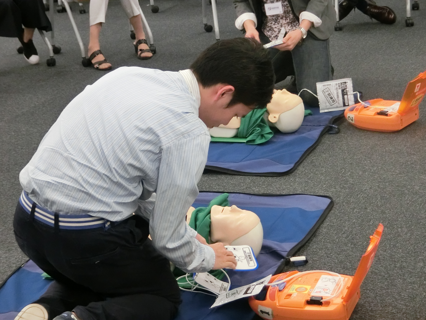 ここからは先生の指示のものと、実際に人形を使用して、心肺蘇生、AEDの使い方をそれぞれ実践していきます。