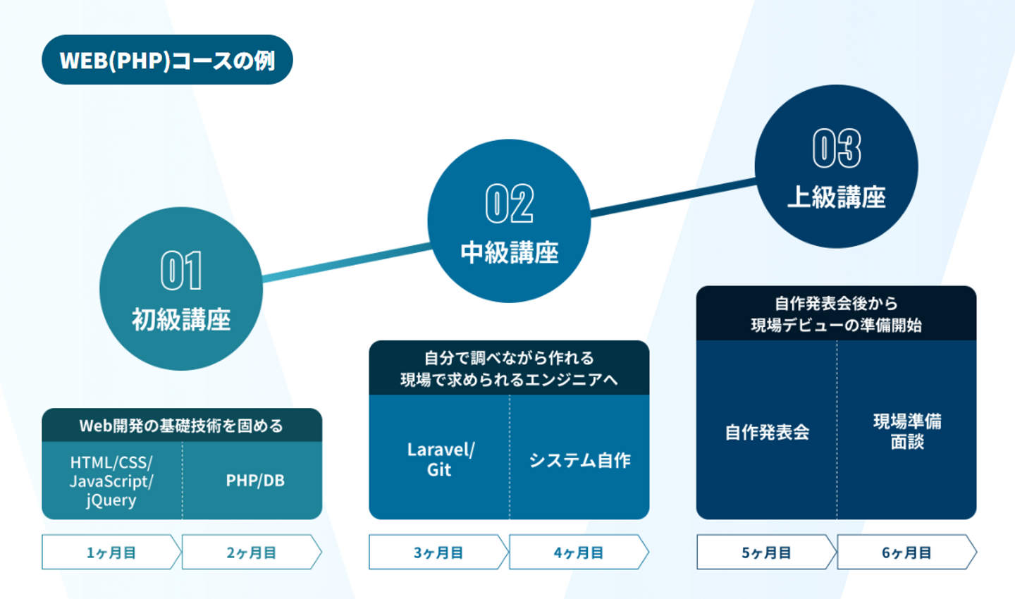 Web開発の実務を模したカリキュラムもたっぷり盛り込まれた実践的な教育システムとなっています!
