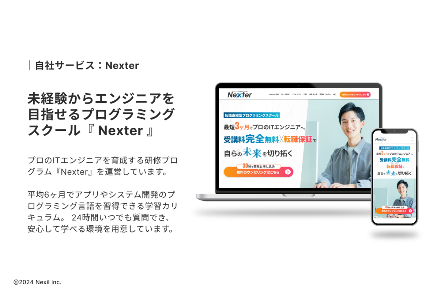 【Nexter(ネクスター)】未経験から最短3ヶ月でプロのITエンジニアを目指す、転職直結型のオンラインプログラミングスクール。未経験からITエンジニアへの転職・フリーランス転身が目指せます。