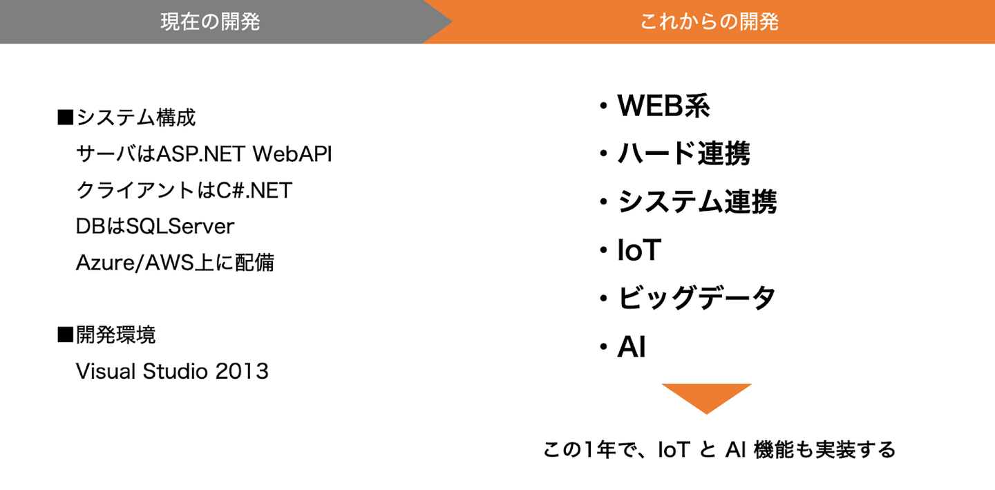 ただ、ようやく一通りの機能が出来てきたので、今後は現場で入力する機能をどんどんと Web 系のフロントで増やしていき、この1年で、IoT と AI の機能も実装していく予定です。さらに色んなシステム連携やハード機器連携、IoT によるビックデータによる更なるAI活用など、色んな技術を経験/挑戦できる環境にしていきます。