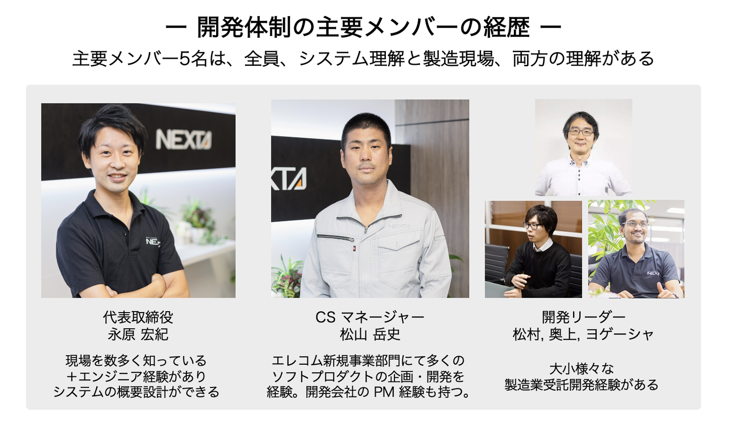 いま、ネクスタはカスタマイズなしの SaaS で、大手 SIer のオンプレ&カスタマイズ かつ 数千万のシステムに勝つことを本気で目指しています。そのために、製造業の現場と流れを熟知した開発リーダー3名と僕の知識・経験を最大限活かし、他社には真似できない開発を高速で続けてきました。