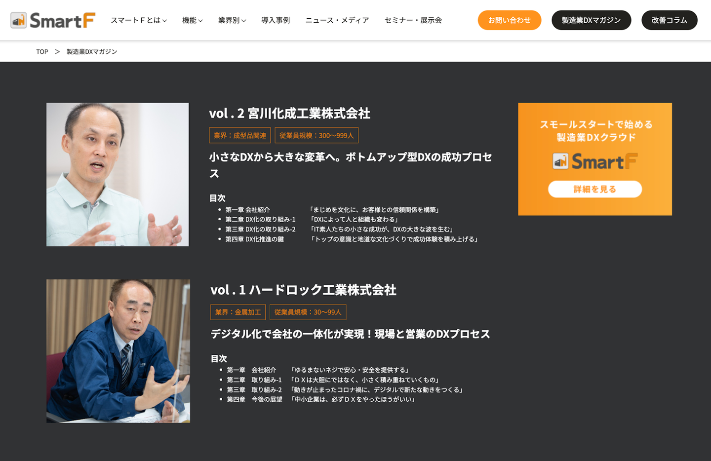 「スマートF」の機能で QR コード管理が導入され、手書きでの管理から解放されたことで、実際にどれだけ時間が削減されたとか、間違いがあったときにこれまでは手書きのものを引っ張り出してこれまで1日かけていたものが数分で済むということであったりだとか、どれだけ効率化されたかが明確な数字でわかったこと、製品を導入したことによるインパクト・熱量が『製造業DXマガジン』に掲載された内容から伝わってきたことはうれしかったですね。