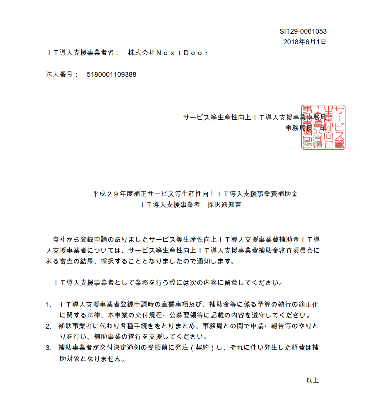 弊社は、「平成29年度補助サービス等生産性向上IT導入支援事業」において