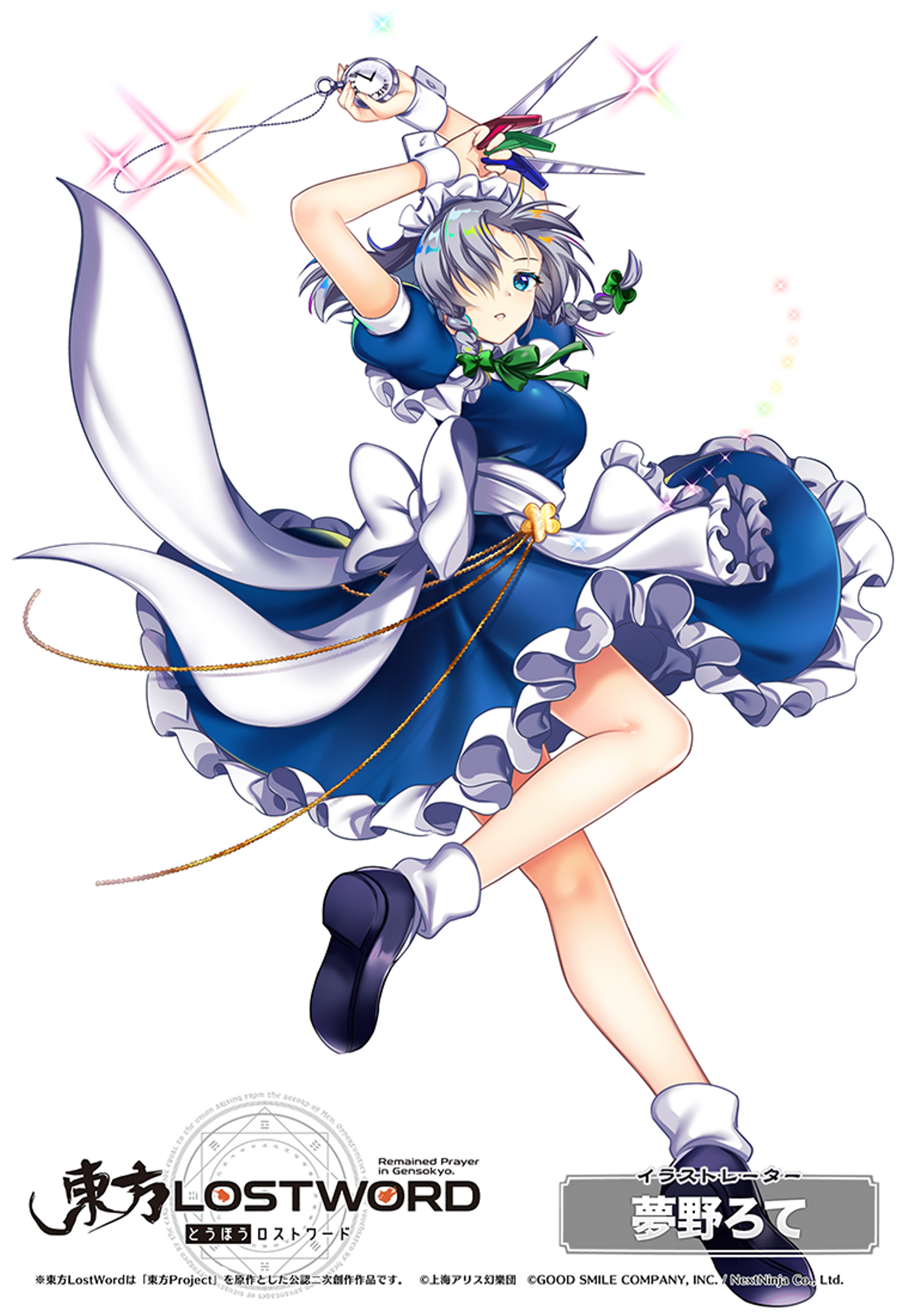 東方LostWord MVプロジェクトでは、キャラクターデザインを手掛ける「夢野ろて」が新規で描き下ろしのイラストを作成しており、各楽曲のMVに登場します。今回は、「十六夜咲夜」の描き下ろしイラストを初公開します。