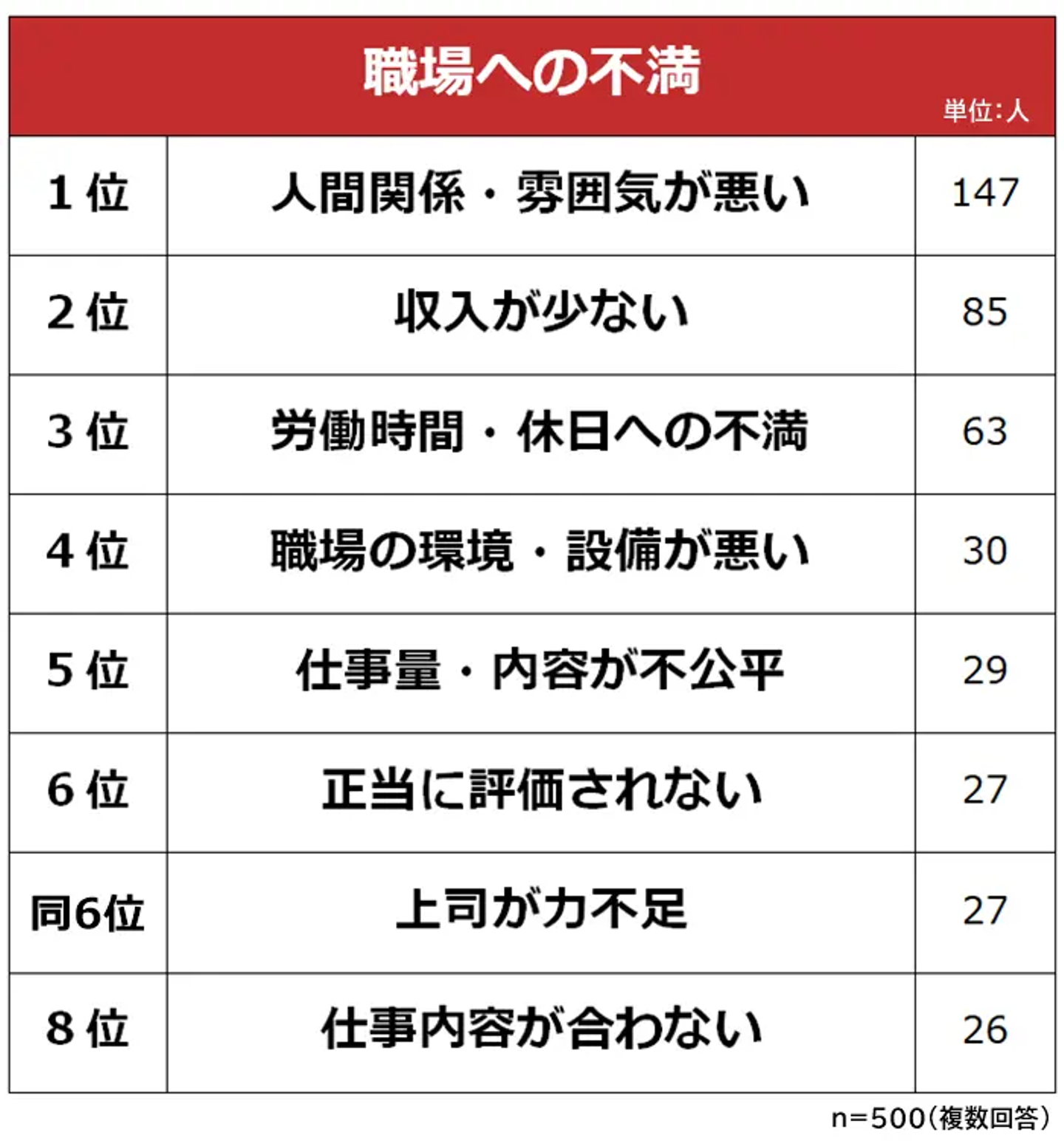 調査によると、他にも現職への問題を感じている人は以下のような不満を抱えています。