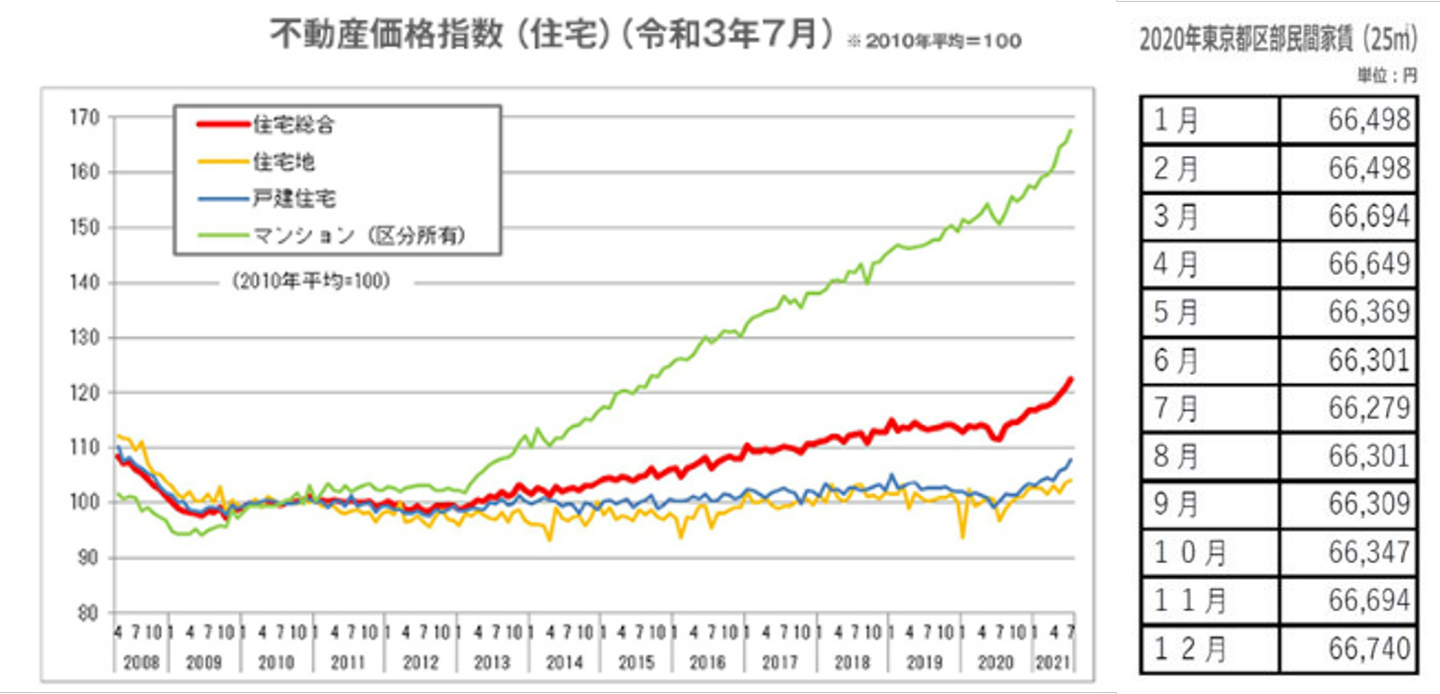 一見、価値が下落していそうなコロナを抜けた今でも不動産の価値は安定して伸びています。(左図)