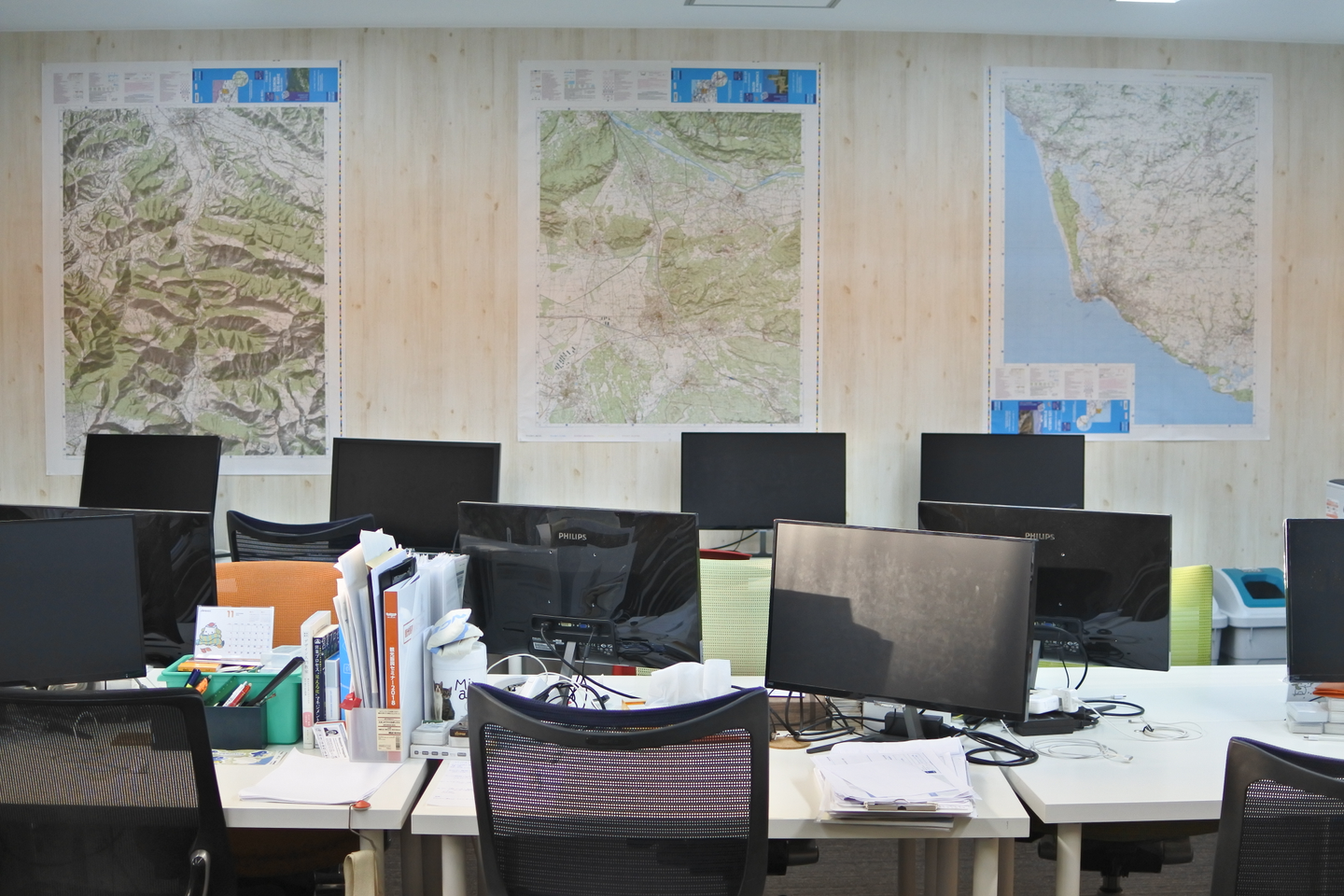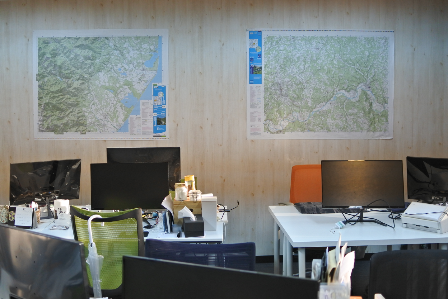 そして現在の執務室はこちら!!(雑多な感じなさておき、大きな地図が貼られています。)