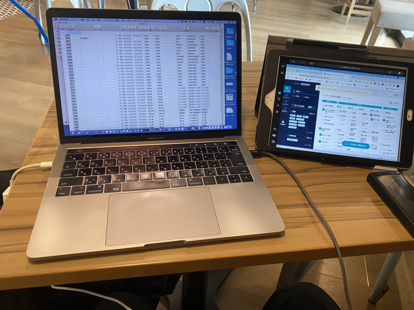 (iPadのsidecarの機能でデュアルディスプレイ。こういうのも使って作業効率落ちない様に徹底。)