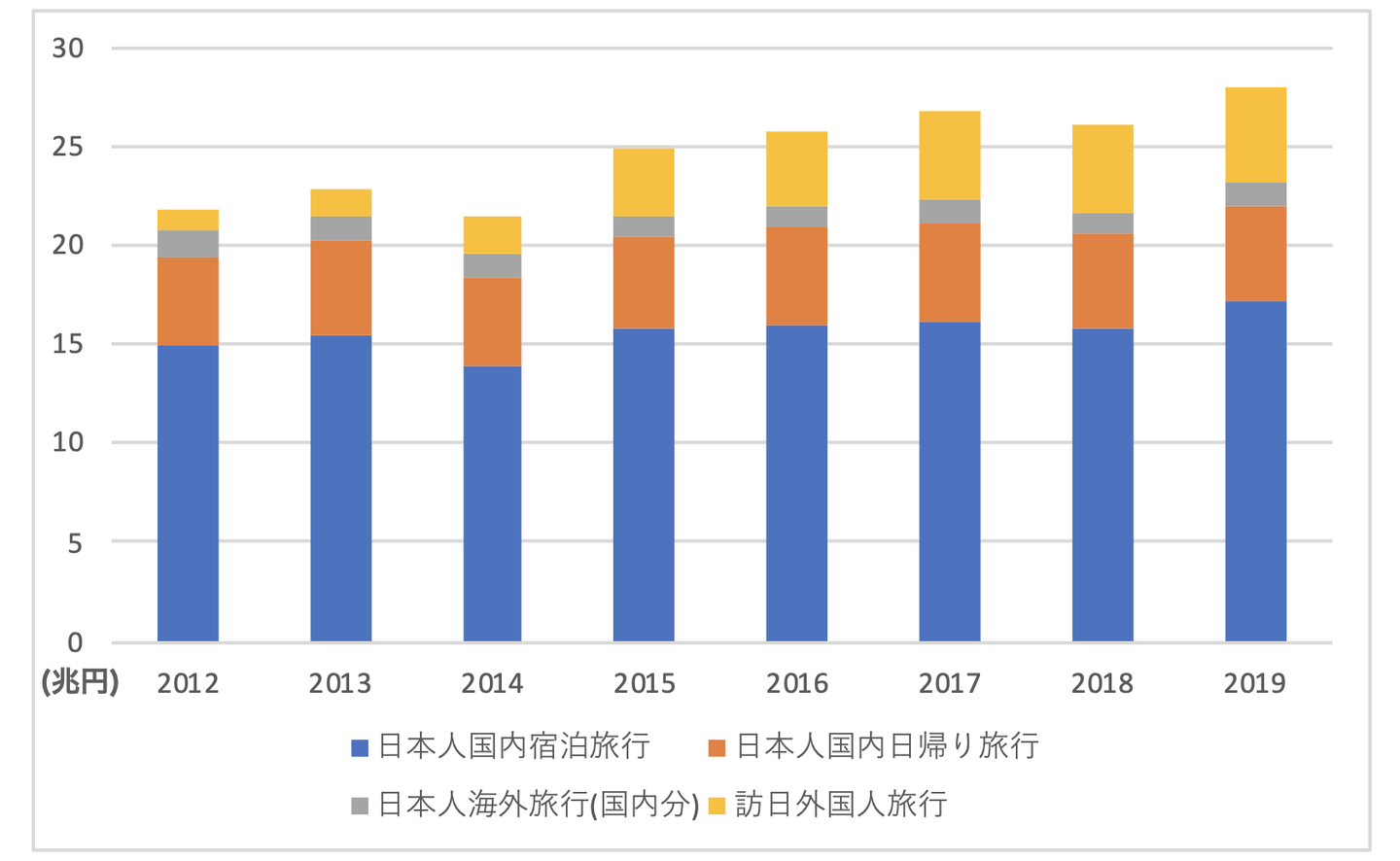 上記の通り、日本の観光消費額は拡大を続け、2019年には27.9兆円の市場規模になってます。