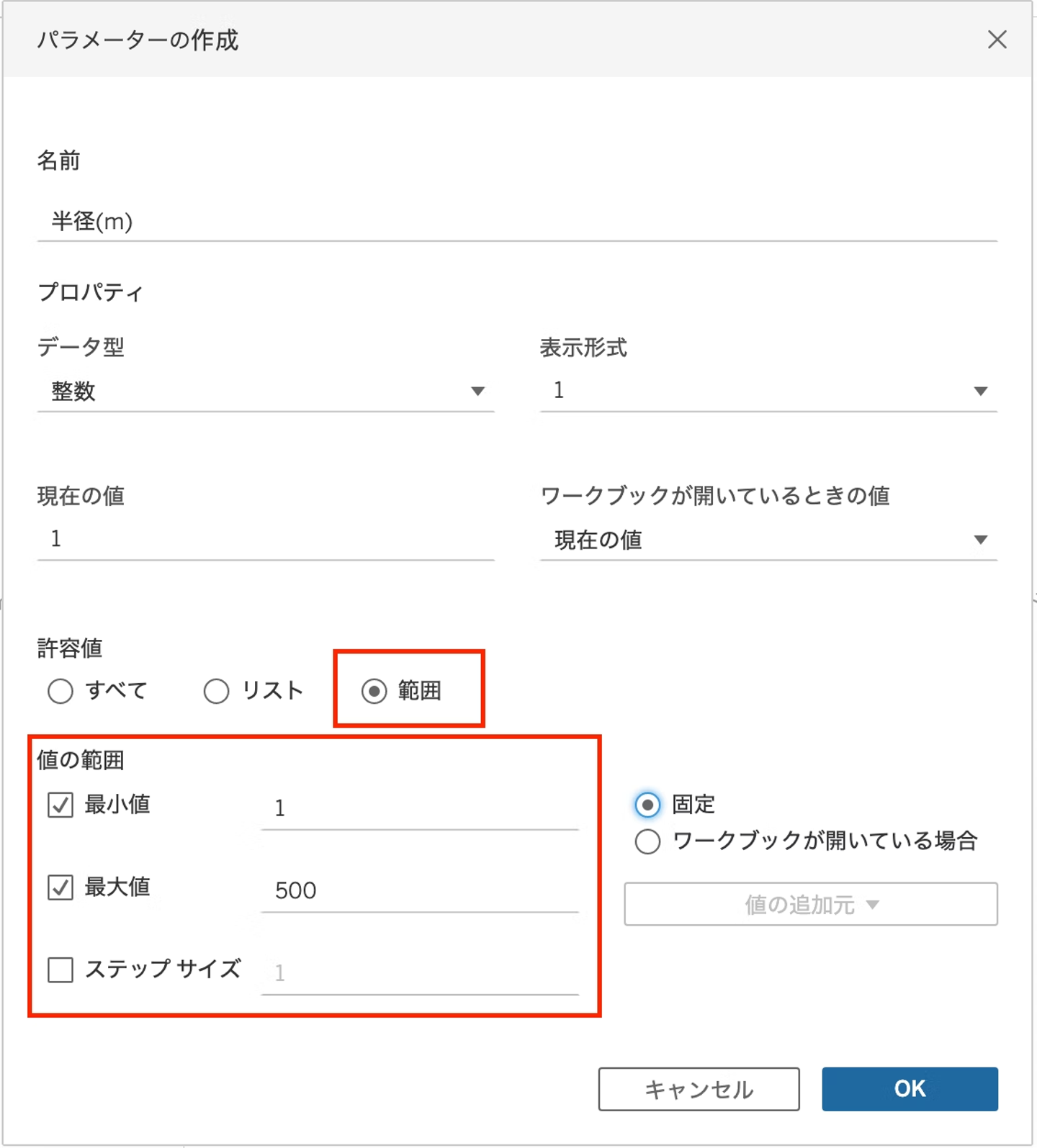 - [最小範囲] を1、最大値範囲を500、ステップサイズをデフォルトで設定します。