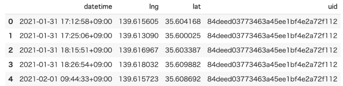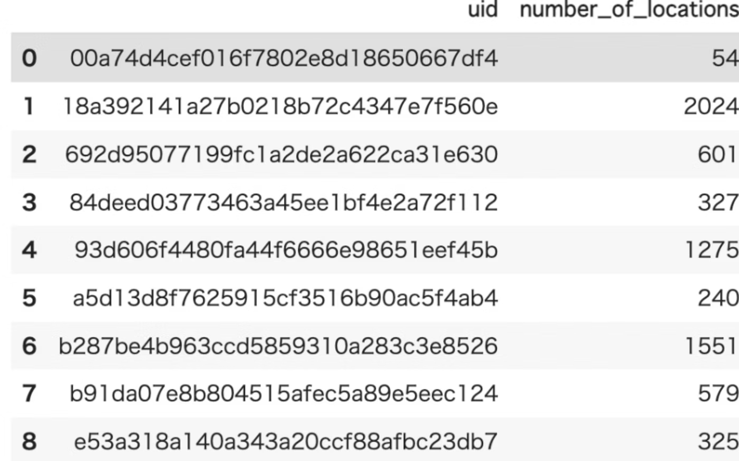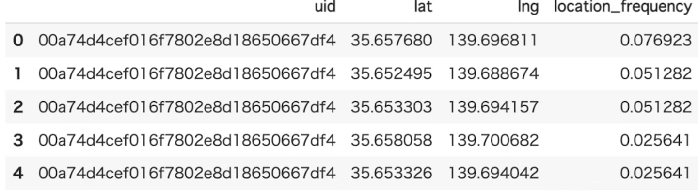 - uidとユーザーが訪問した場所の緯度経度、その場所に訪問する頻度(location_frequency)が出力されます。