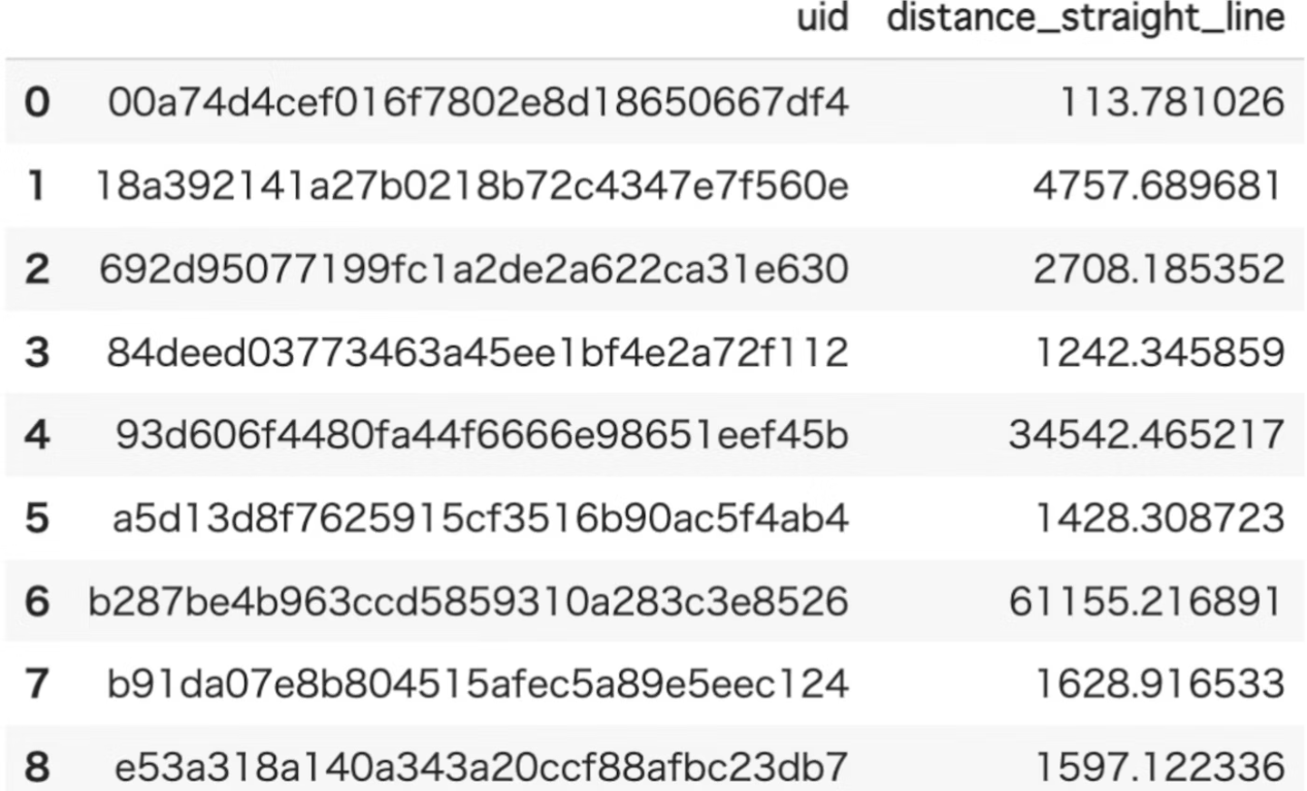 - ユーザーの総移動距離を算出できるので、移動が多いユーザー、反対になかなか移動がないユーザーを判定したりすると、データ内のユーザーの傾向が掴めそうです。