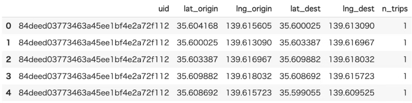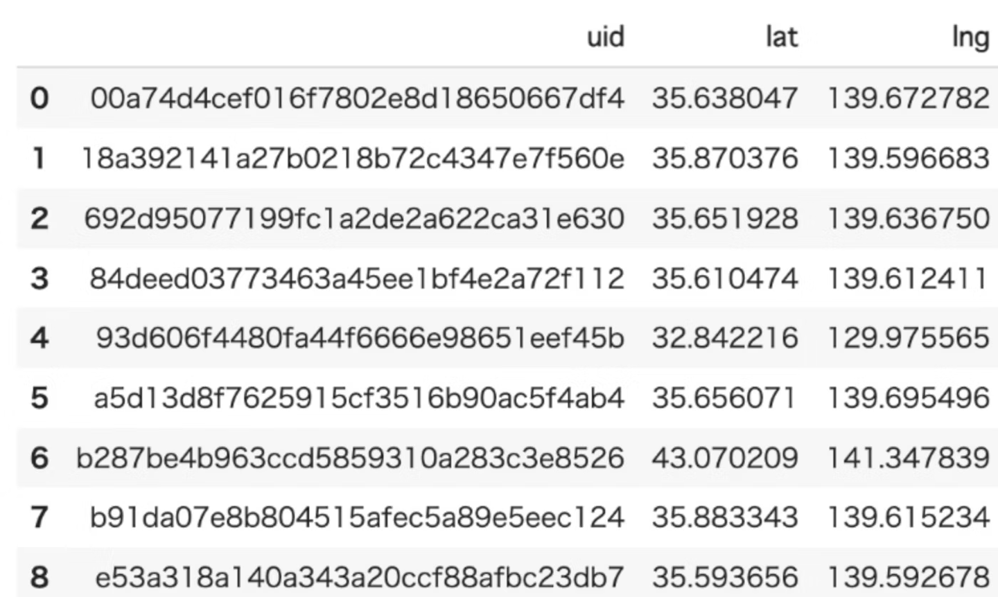 - uidと訪れた場所の緯度経度、訪問頻度のランク(frequency_rank)が表示されます。