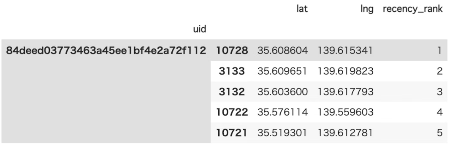 - uidと訪れた場所の緯度経度、最新から何番目に訪れたかのランク(recency_rank)が表示されます。