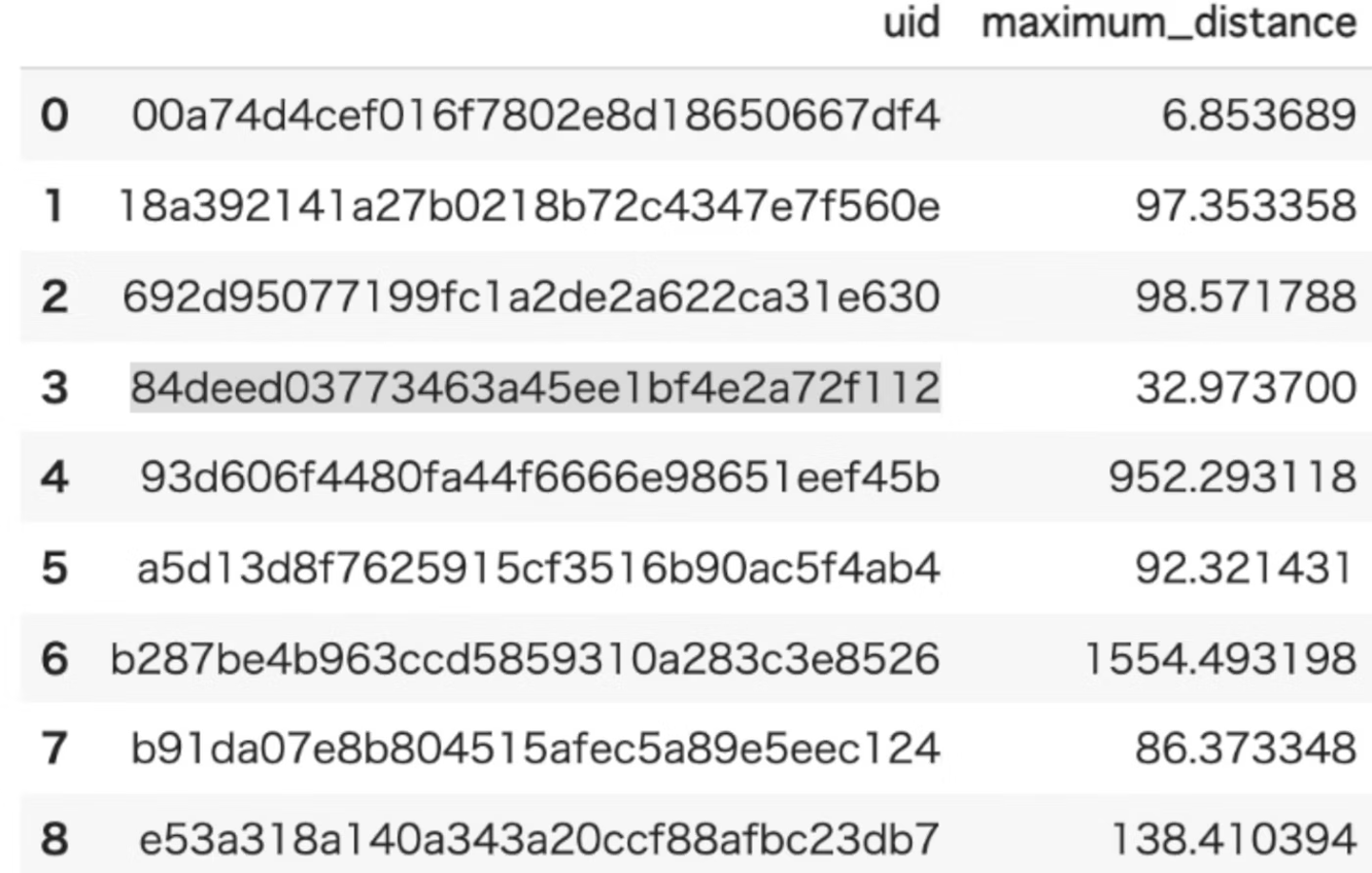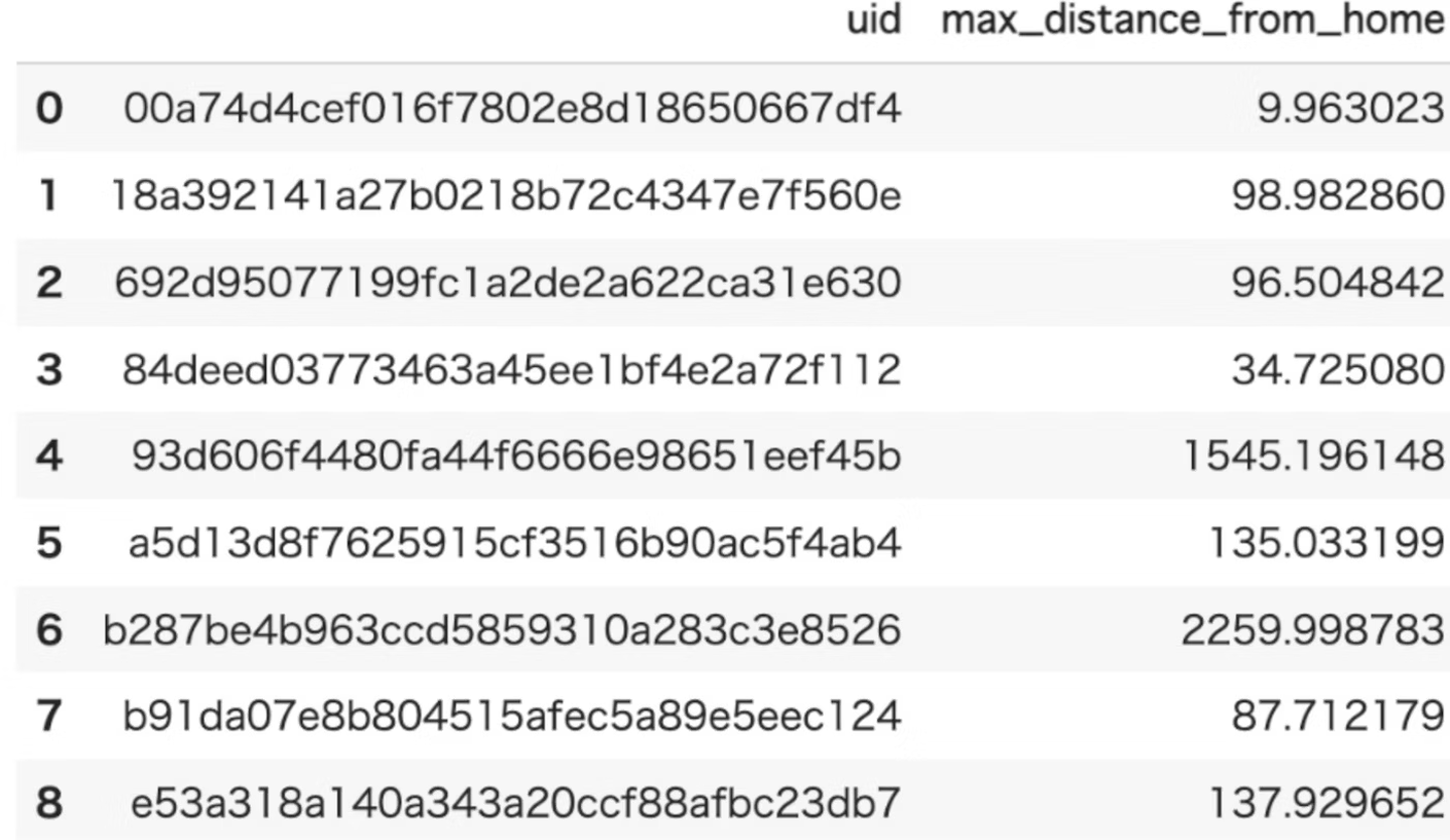 - こちらはユーザーが自宅と判断した場所から移動した最大距離を算出します。