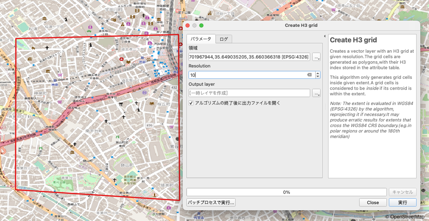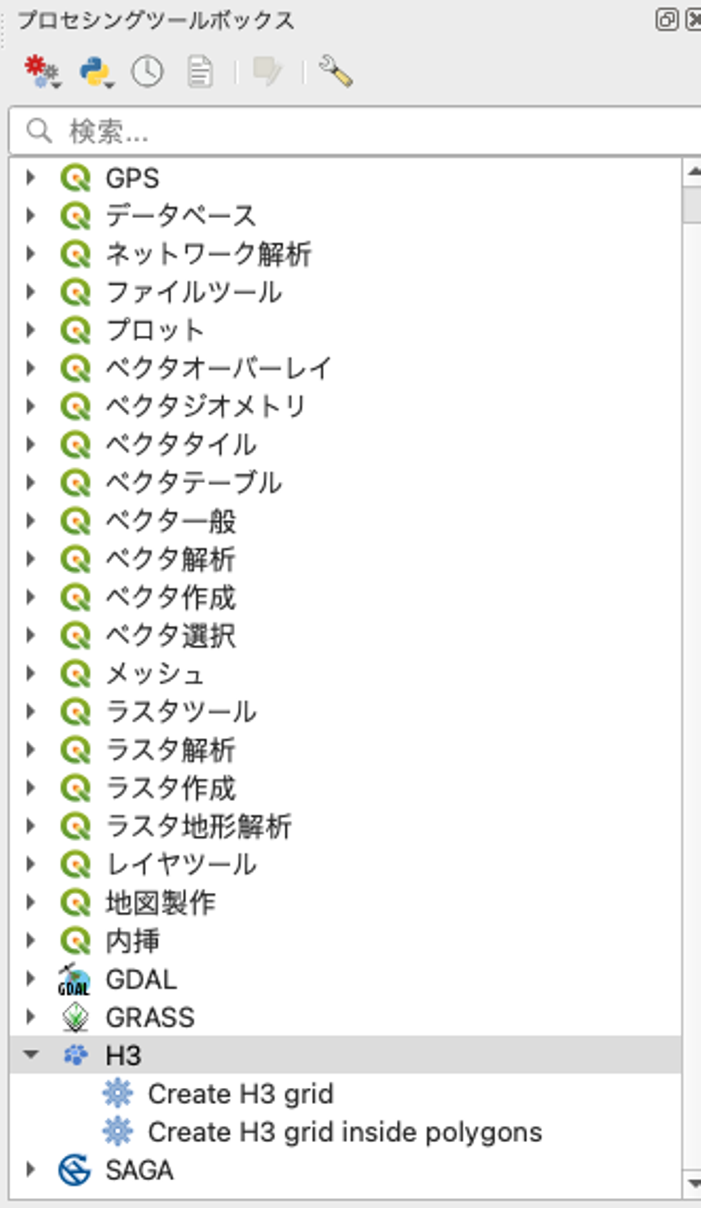 プロセシングツールボックスの中にH3というツールが登場しているので、そこから作成します。